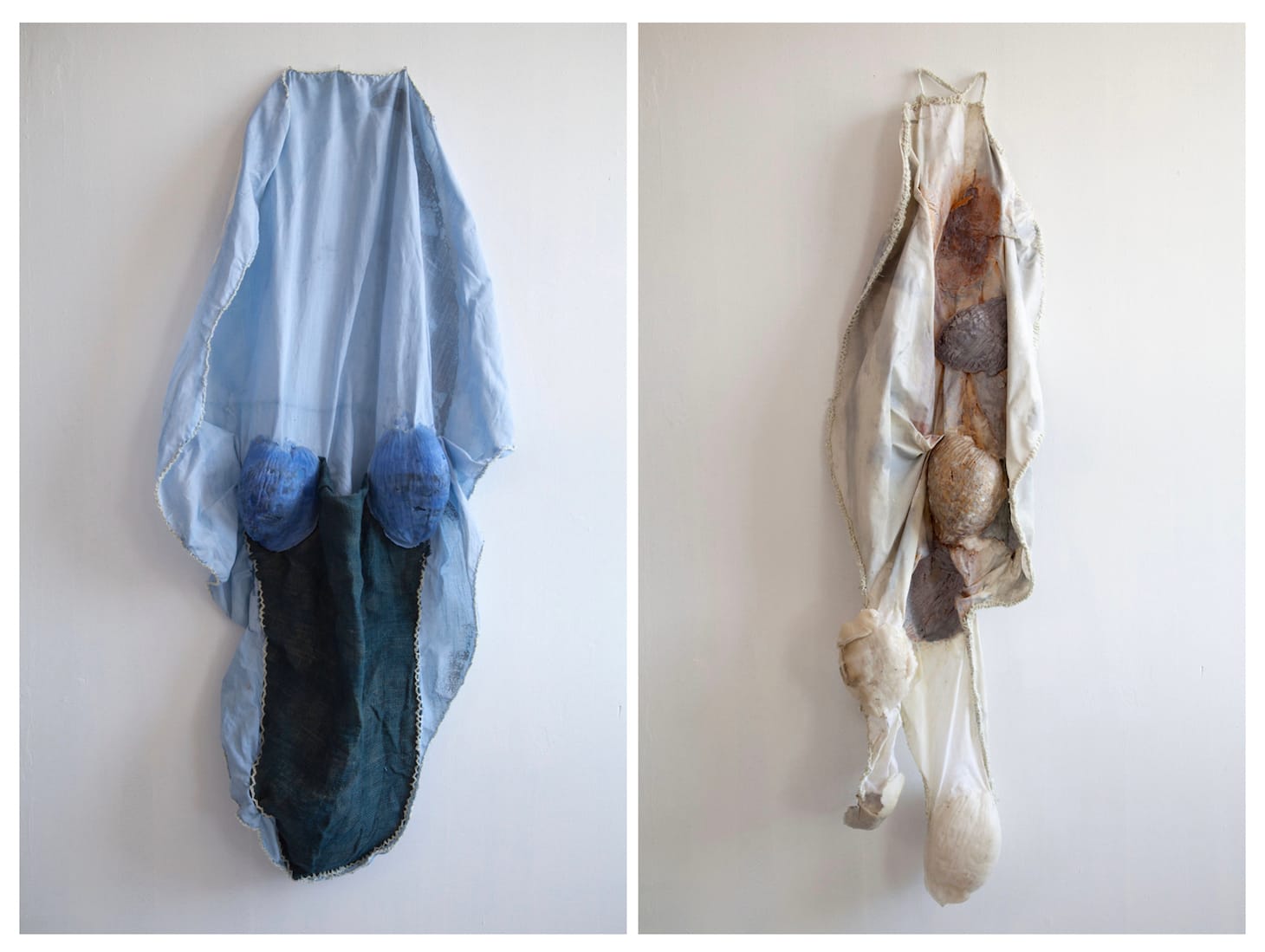 “These works are offerings,” María de los Àngeles Rodríguez Jiménez notes in her artist statement. “Handled, staged, and witnessed in space, my offerings attempt [to] activate the subversive power of devotional practices.” Born in Holguín, Cuba, from which she later migrated to New Orleans, de los Àngeles Rodríguez Jiménez’s work often references spirituality and memory. Her sculptural works “Menino O” and “Menina Y” pay tribute to the Yorùbá orishas Yemaya and Obatala, the revered deities who preside over the water and sky, respectively, and reflect the artist’s deep interest in the symbolism of the womb, evinced here through her use of wax castings of coconuts. “I was thinking about clothes being hung to dry when making these works. But also clothes being remnants of bodies when they come off us, and thus still part of the body,” she explained over email.