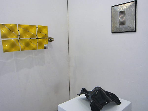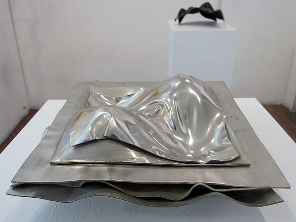 The earliest work in Turbulence is “Untitled (Maroon),” a cascade of colored metal that Klevickas stamped with waves and hollows. All of his art starts as a flat surface and either through molding or physical interference develops a landscape of waves with few sharp angles, reflecting his “engineering mind” that is intrigued by how spatially these planes can morph into complex curves. While some works in Turbulence are on pedestals, others, like “Untitled (Maroon)” hang from the wall, yet are still visible in three dimensions through mirrors embedded in the sculptures. Klevickas said that he thinks sculpture is something to “not just have the one view,” and even standing in place a viewer can see a different angle of a piece. They also play off his fascination with both the physical and conceptual sense of suspension in the way a material holds its own hanging from a wall.