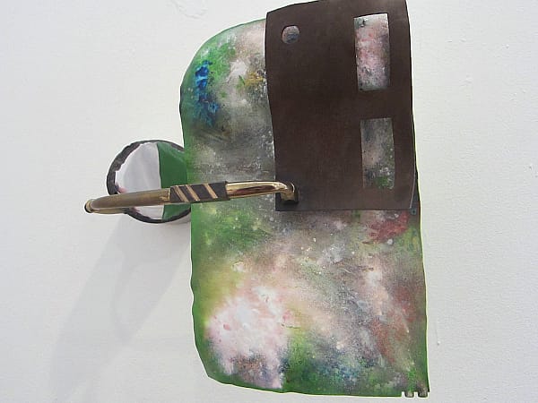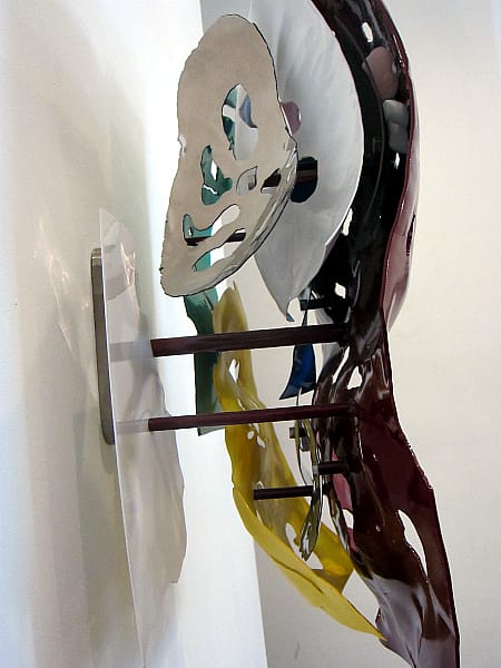 One of the standout works in Turbulence is “Bauble” (2002), which has a subtle use of color that is absent from the glossier pieces. For “Bauble,” he used a found gold bar and scraps from a place that manufactures the guts for televisions. The punched out details were already present when Klevickas found the metal, but the combined materials and layered form mask their origins and make for a surprisingly elegant sculpture from something that started in a dumpster.