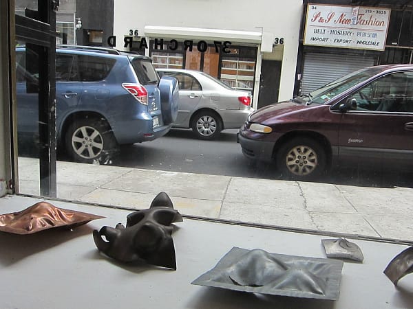The Orchard Windows Gallery is the size of a cramped studio apartment, holding a narrow space at the front and a larger room at the back, with a rawer feel than other galleries on Orchard Street. Much of Klevickas’ work is as glossy as a sports car straight out of the factory (automotive paint is a recurring material) and others have a tarnished gleam on their futuristic shapes, like cast-offs from some as yet undiscovered machine. The contrast between the gallery and the art works well, humanizing art that could be distant in a more pristine gallery with its heavy industrial feel, and giving the gallery an edge of modern refinement.