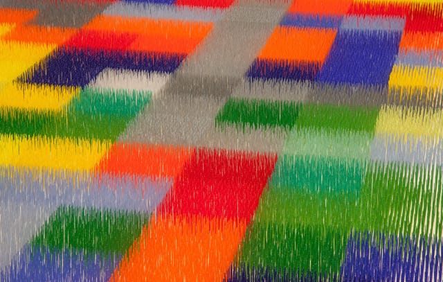 The exhibition Liza Lou: Color Field and Solid Grey also includes Lou’s Solid Grey and Color/White canvases, a series of “paintings” woven out of glass beads.