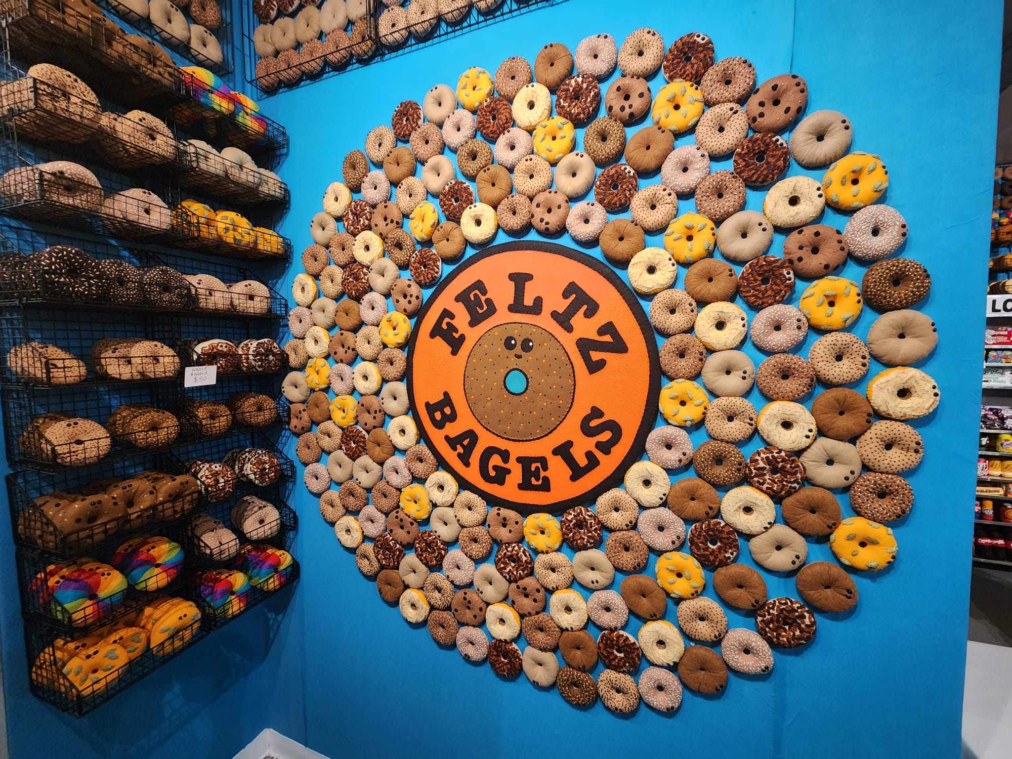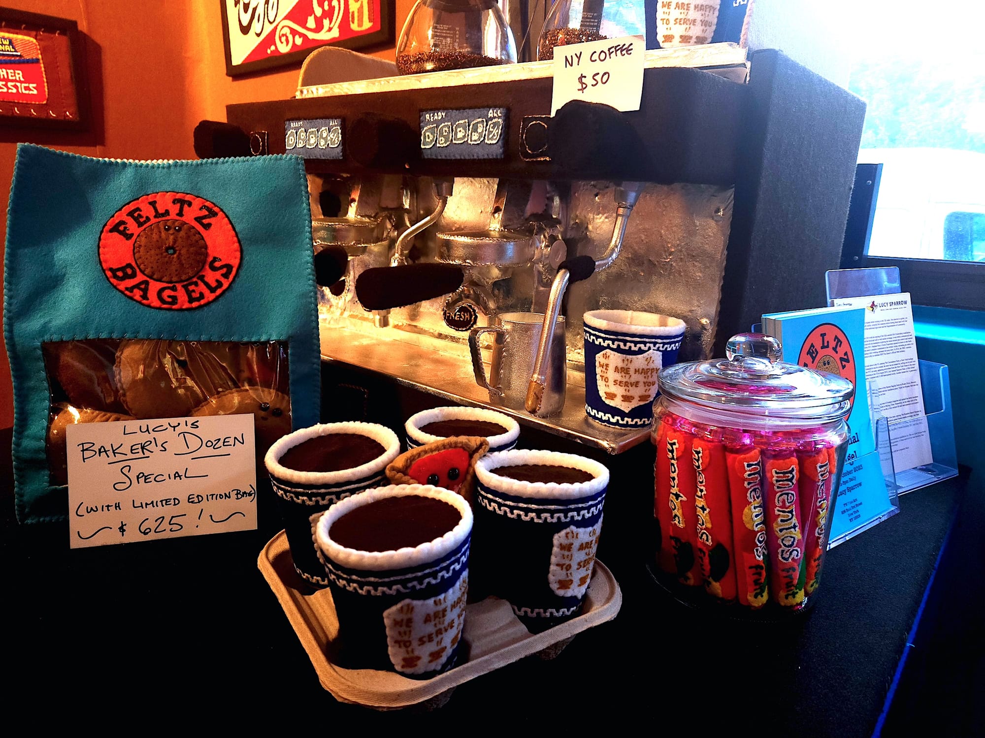 This isn't Sparrow's first rodeo with makeshift marketplaces, and it's certainly not her last. The artist jumped in headfirst with a fully functional felt Cornershop in London's East End in 2014, and followed up in 2015 with a felted erotic shop with an automated peep show on the other side of the city in SoHo. Her first solo exhibition in New York was a 9,000-piece bodega pop-up called 8 Till Late in 2017. Feltz Bagels, however, is the most interactive installation she has done so far.