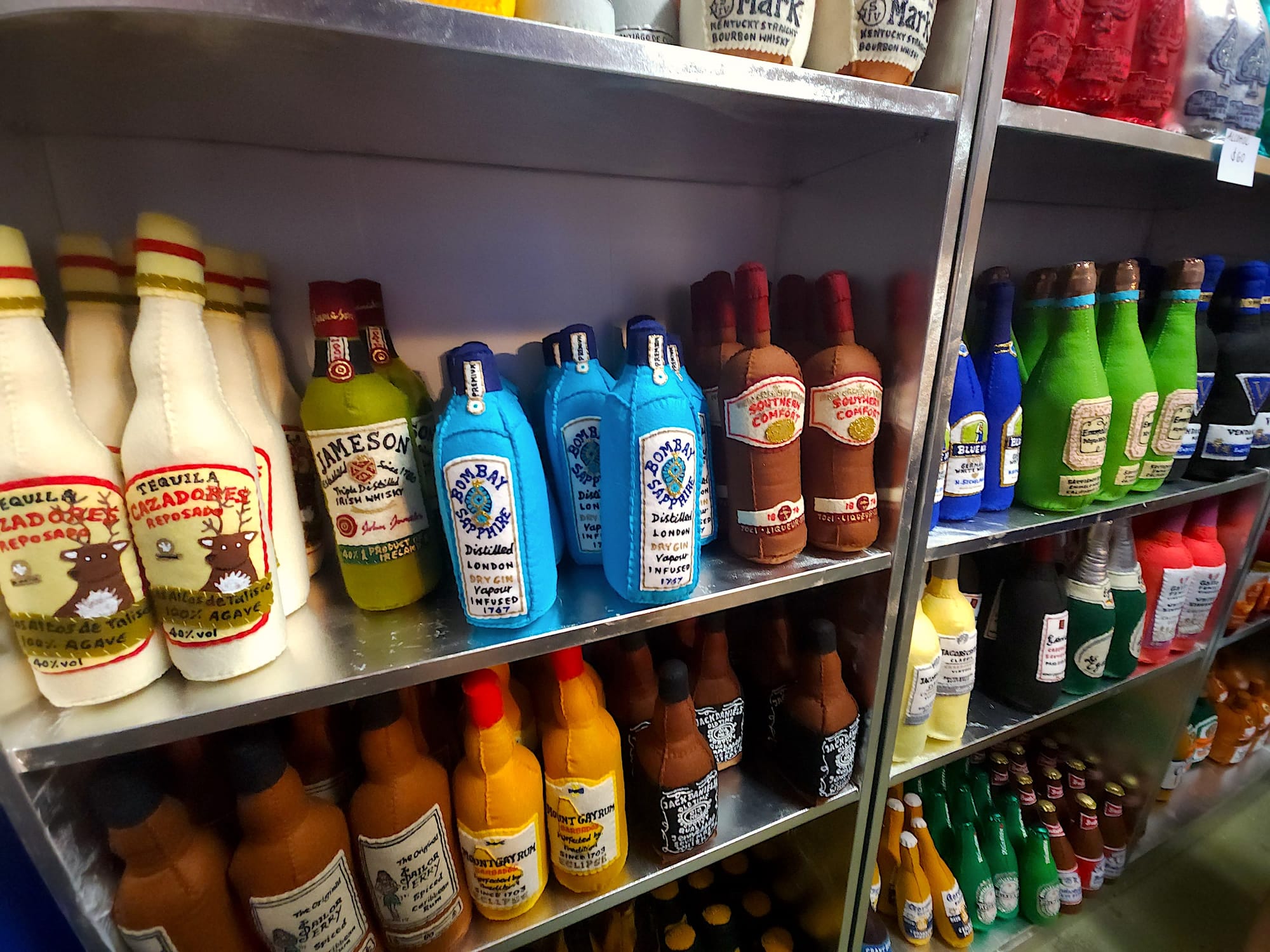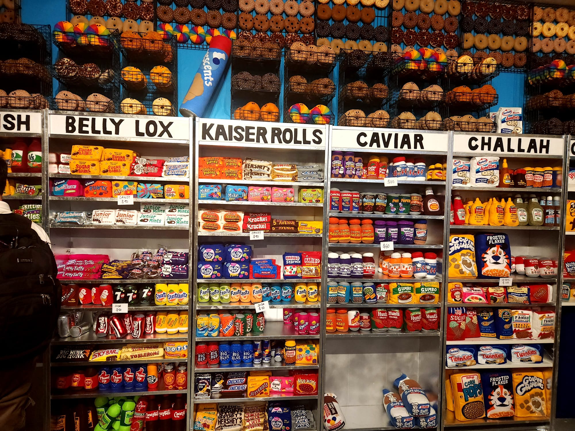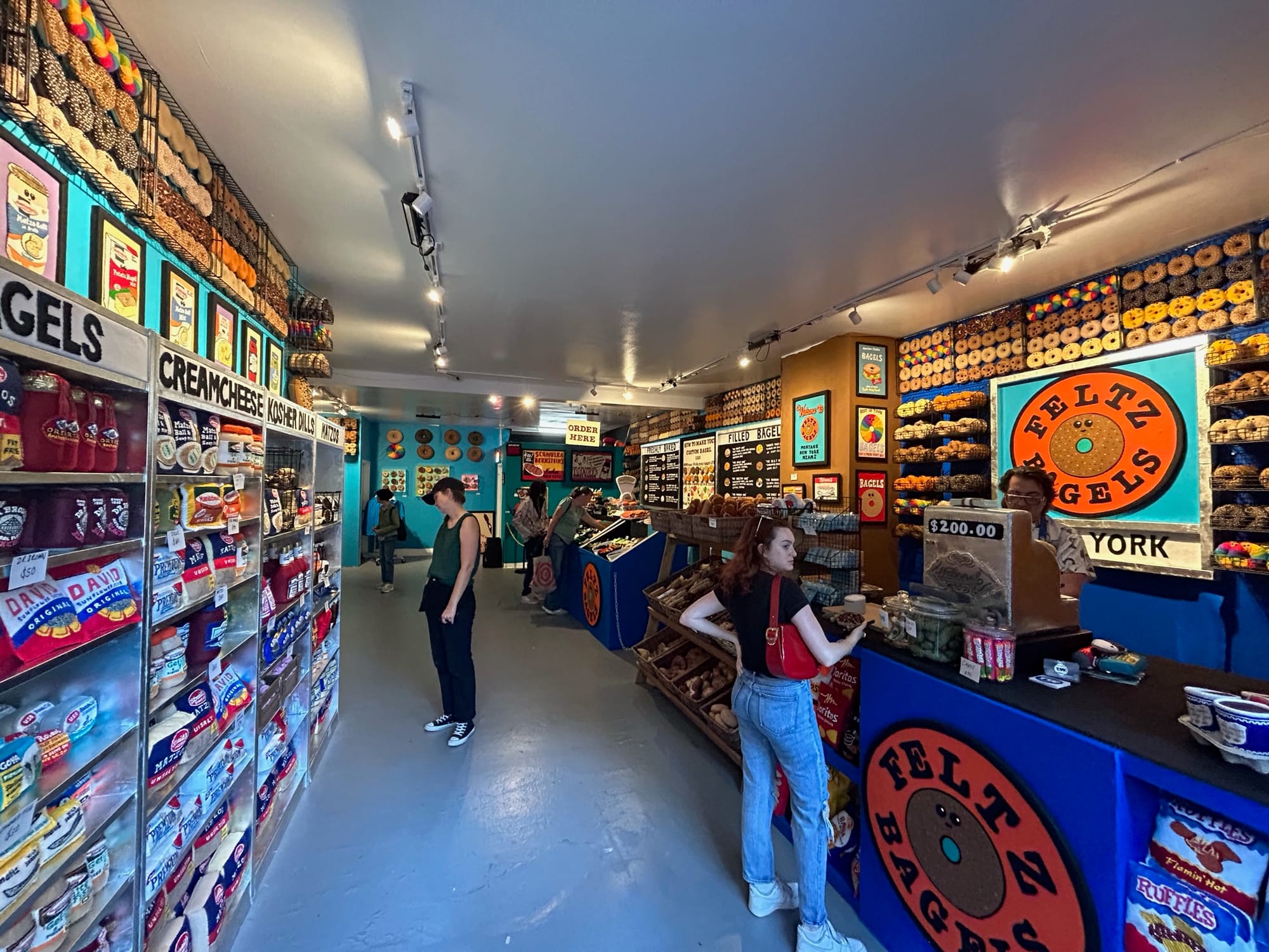 From menu boards and the deli counter to shelves fully stocked with standard American and Eastern European groceries, tasty treats, and a somewhat nefarious liquor corner in the back of the shop (that also peddles some less kosher substances), nearly every inch of Feltz Bagels is covered in the crafty fabric sampling every color imaginable.
