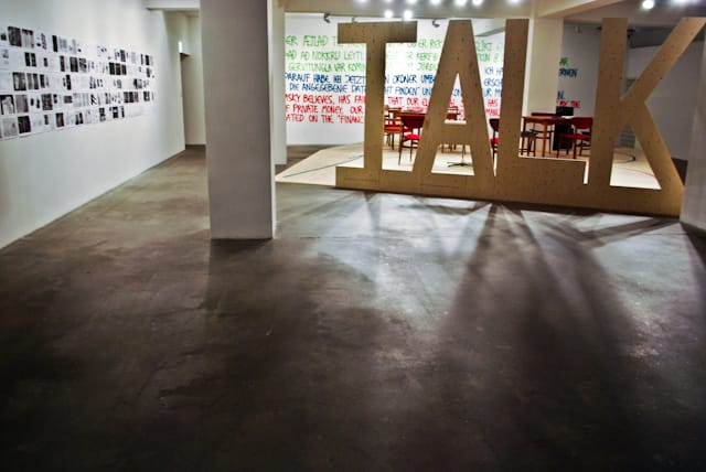 The most overtly political section of the (I)ndependent People show was a gallery given over to the Kling & Bang gallery and to Jóna Hlíf Halldórsdóttir & Hlynur Hallsson. There was a dizzying array of artists involved with this large space, and much of the work changed over the course of the show. There was a relational aesthetics–inspired raw wooden platform with tables, books and pens where artist talks, debates and conversations were being held throughout the duration of the exhibition. I wish I had been there for one of the conversations; finding myself alone in a relational installation felt pointless.