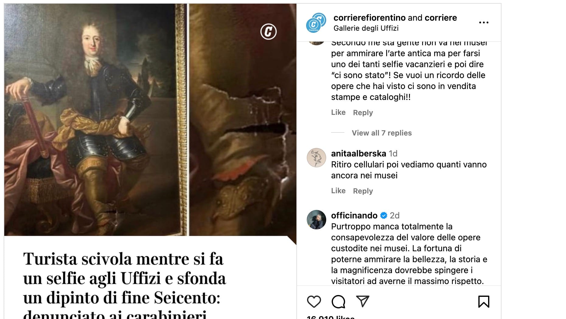It seems that every summer, a handful of tourists visiting Italy wreak havoc on archaeological sites and fine art exhibitions nationwide. This Saturday, June 21, a visitor to the Uffizi Galleries in Florence tore a hole in a 17th-century portrait after stumbling backwards during an attempt to mimic the subject's pose for a photo.
