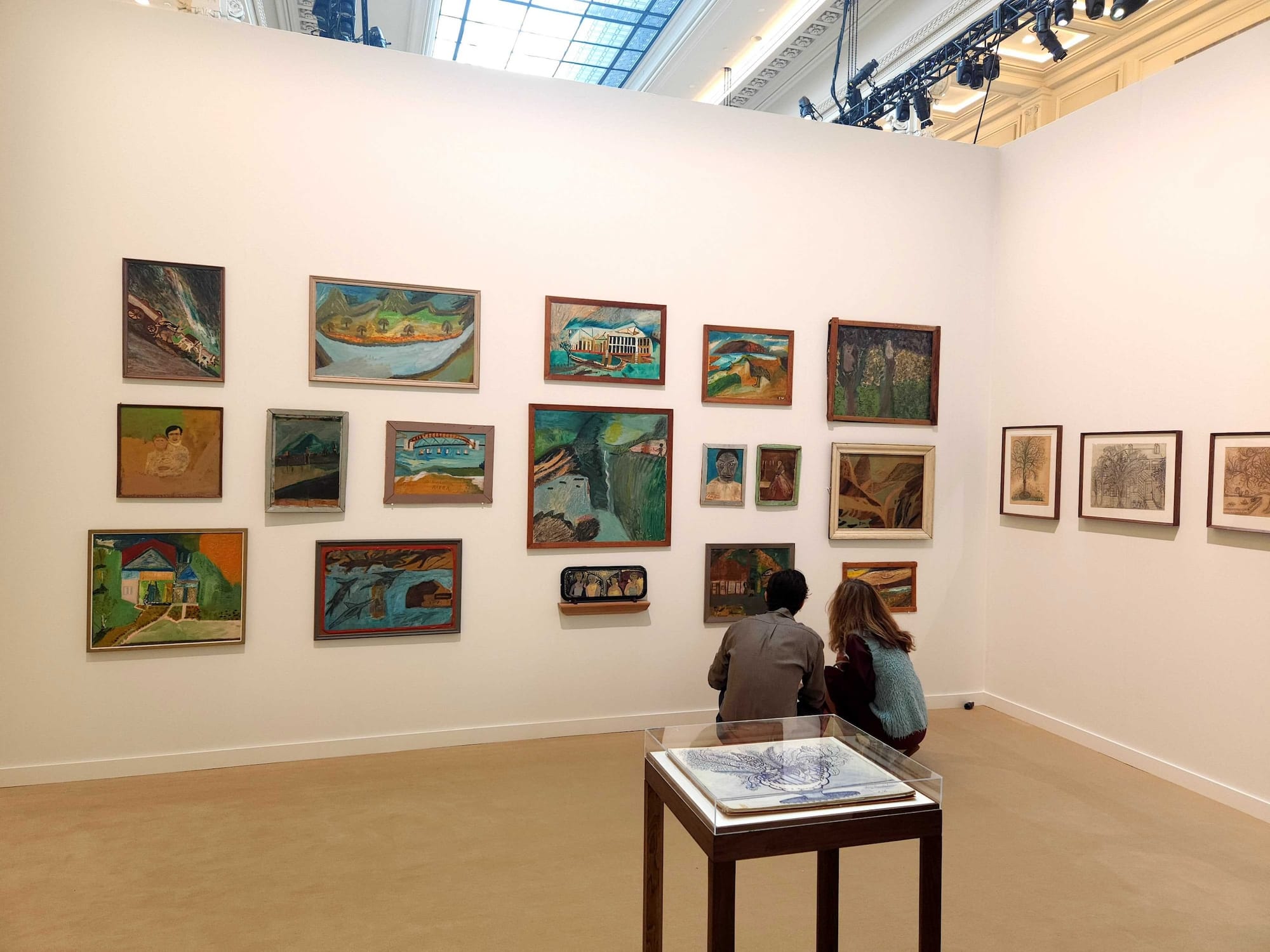 On the opposite corner of the room, Dutton gallery's colorful dual presentation of outsider artists generated quite a bit of foot traffic, for good reason. More than a dozen mixed-media paintings framed with scavenged wood by late Australian artist Selby Warren, who lived, worked, and tinkered in the backcountry before picking up the paintbrush in his 70s, hung salon-style on a wall.