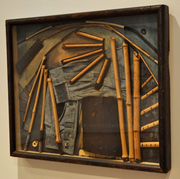 This may be the oddest work by Arthur Dove, “Goin’ Fishin'” (1925), I’ve ever encountered. It is one of only 25 collages and assemblages made by the early 20th C American artist. While there are many theories about the meaning of this work, Dove said “his starting point was simply an African-American man sitting on the pier.”