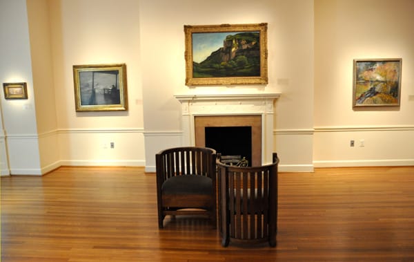 The galleries in the Phillips mansion feel more domestic and fireplaces dominate the rooms that are hung with more modest sized work. Gustave Courbet’s “Rocks at Mouthier” (c.1855) hands in the center of this scene and it is flanked by John Sloan’s “The Wake of the Ferry II” (1907) on the left and John Henry Twachtman’s “My Summer Studio” (c.1900) on the right. You can also spot Albert Pinkham Ryder’s “Dead Bird” on the far left.