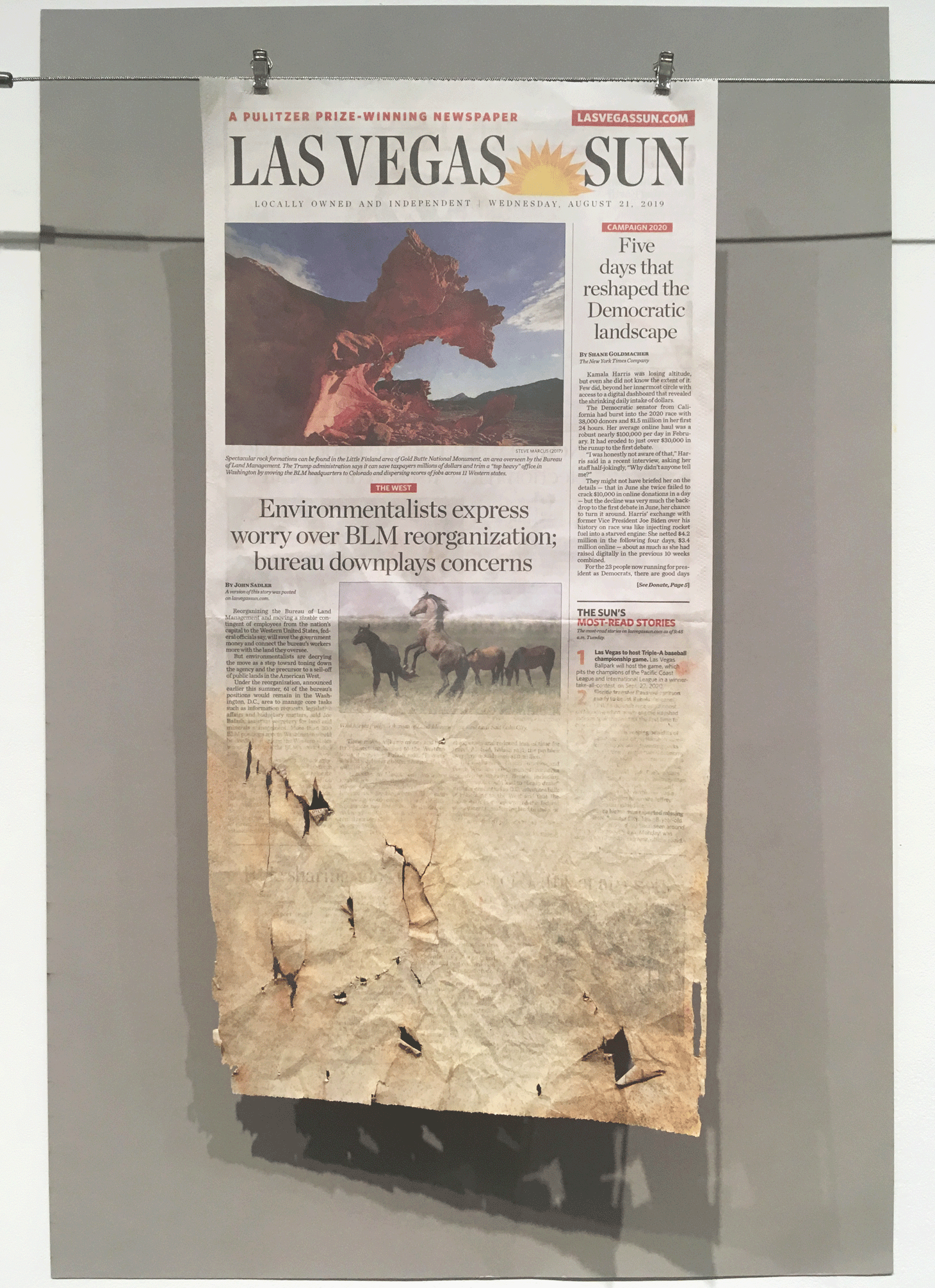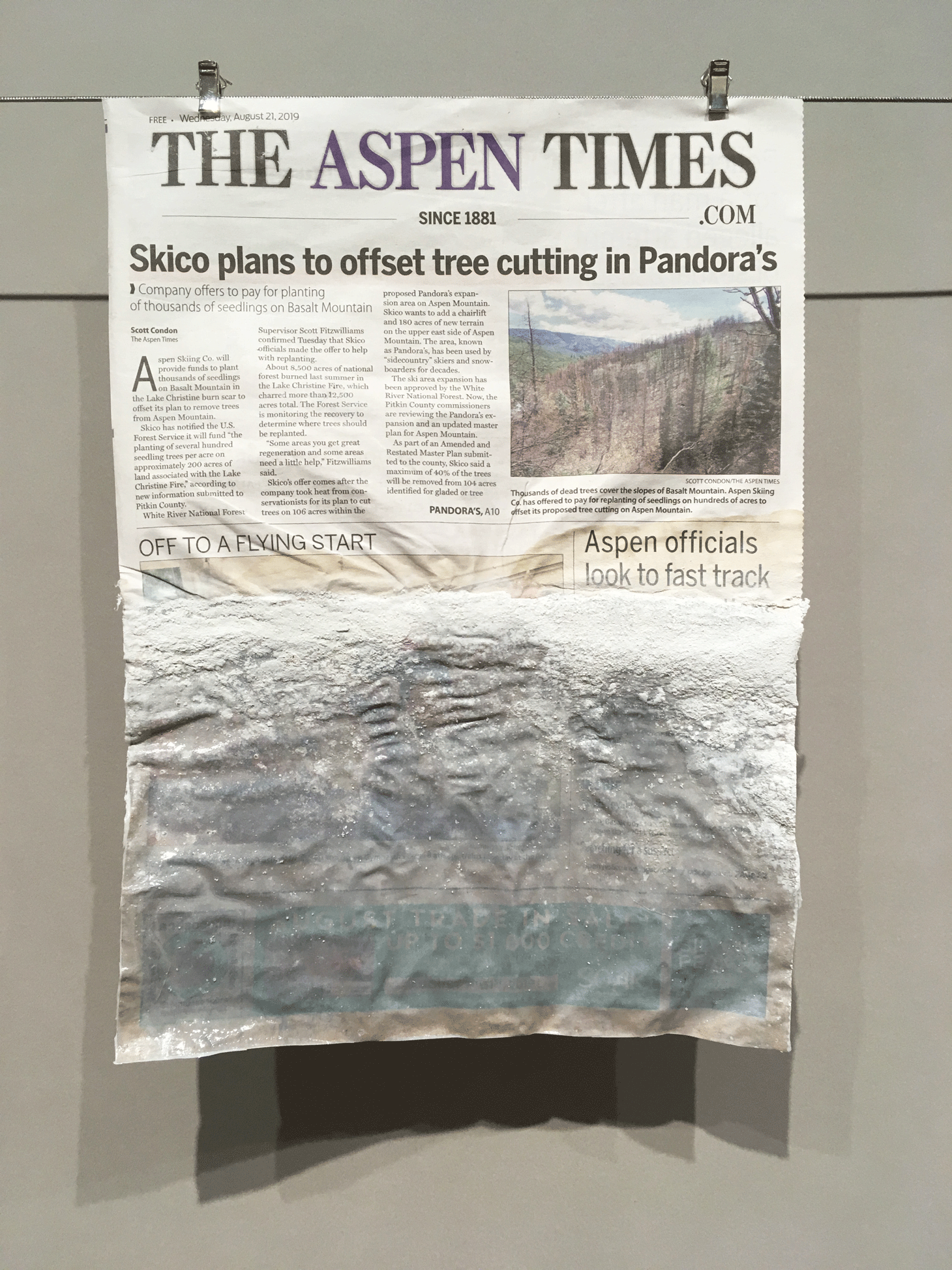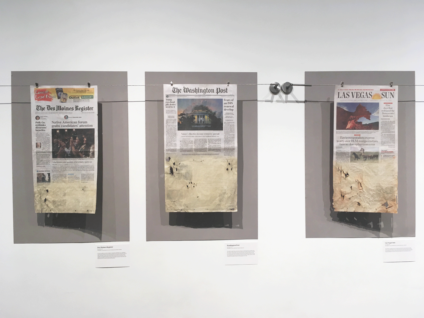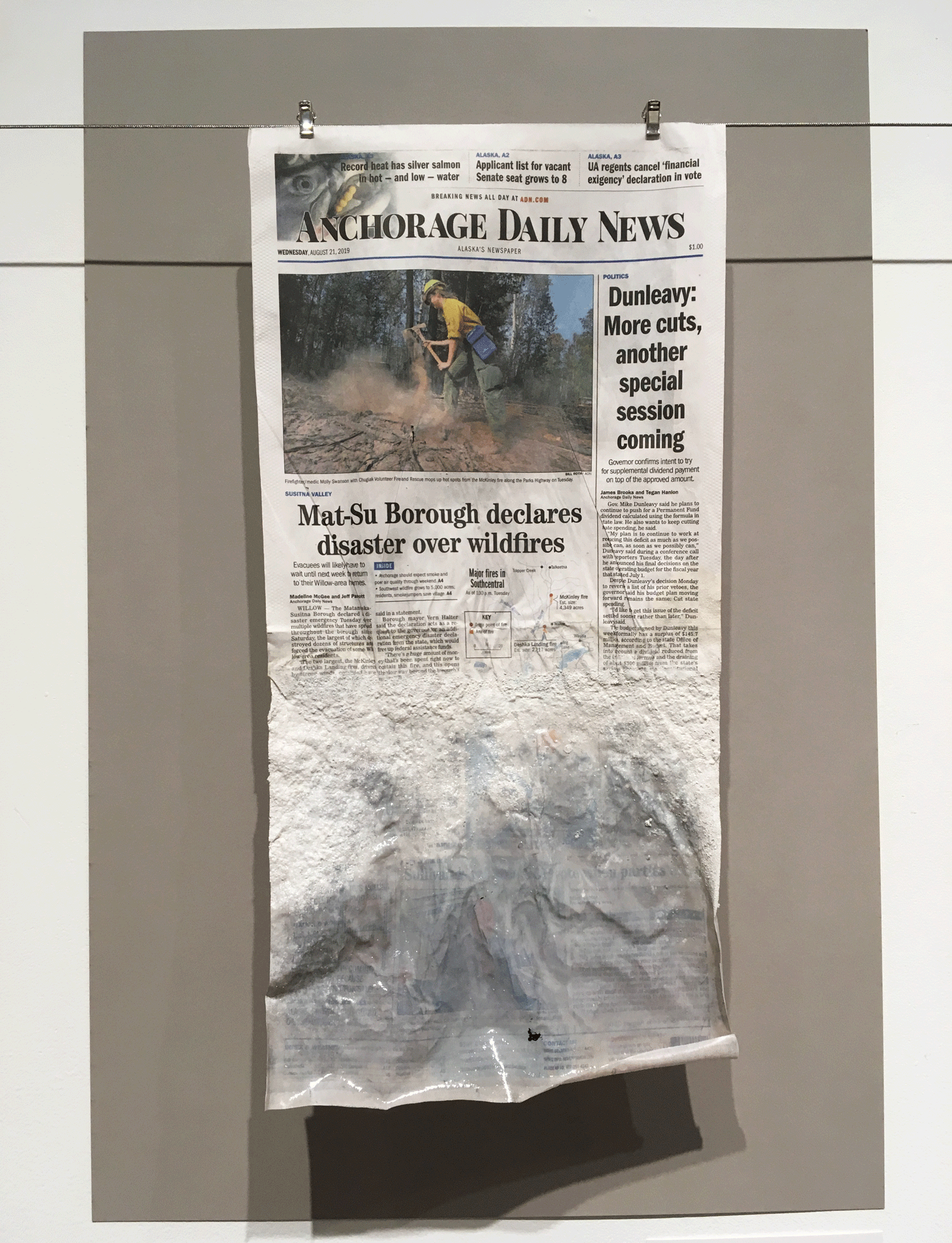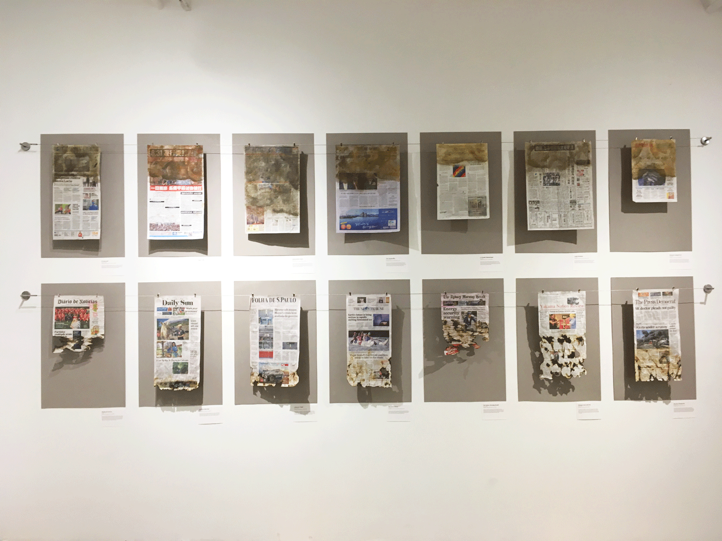 Open to the public for just three hours (9am-12pm), Flood the News: Bringing the Climate Change Crisis to the Front Page targeted a narrow audience of New York journalists (most of whom have already attended a press preview the night before). The exhibition aims at urging news publications to bring the climate crisis to their front pages with works that visually illustrate environmental calamities. It does so by exhibiting 41 flooded, scorched, and damaged front pages of world newspapers including the New York Times, Folha de S.Paulo (Brazil), Le monde diplomatique, the Australian, and Dagens Nyheter (Sweden). The front pages have been treated in various techniques to visualize the catastrophic real-life consequences of rising sea levels, hurricanes, intensifying heat waves, melting ice caps, and other climate hazards threating the inhabitants of this planet.