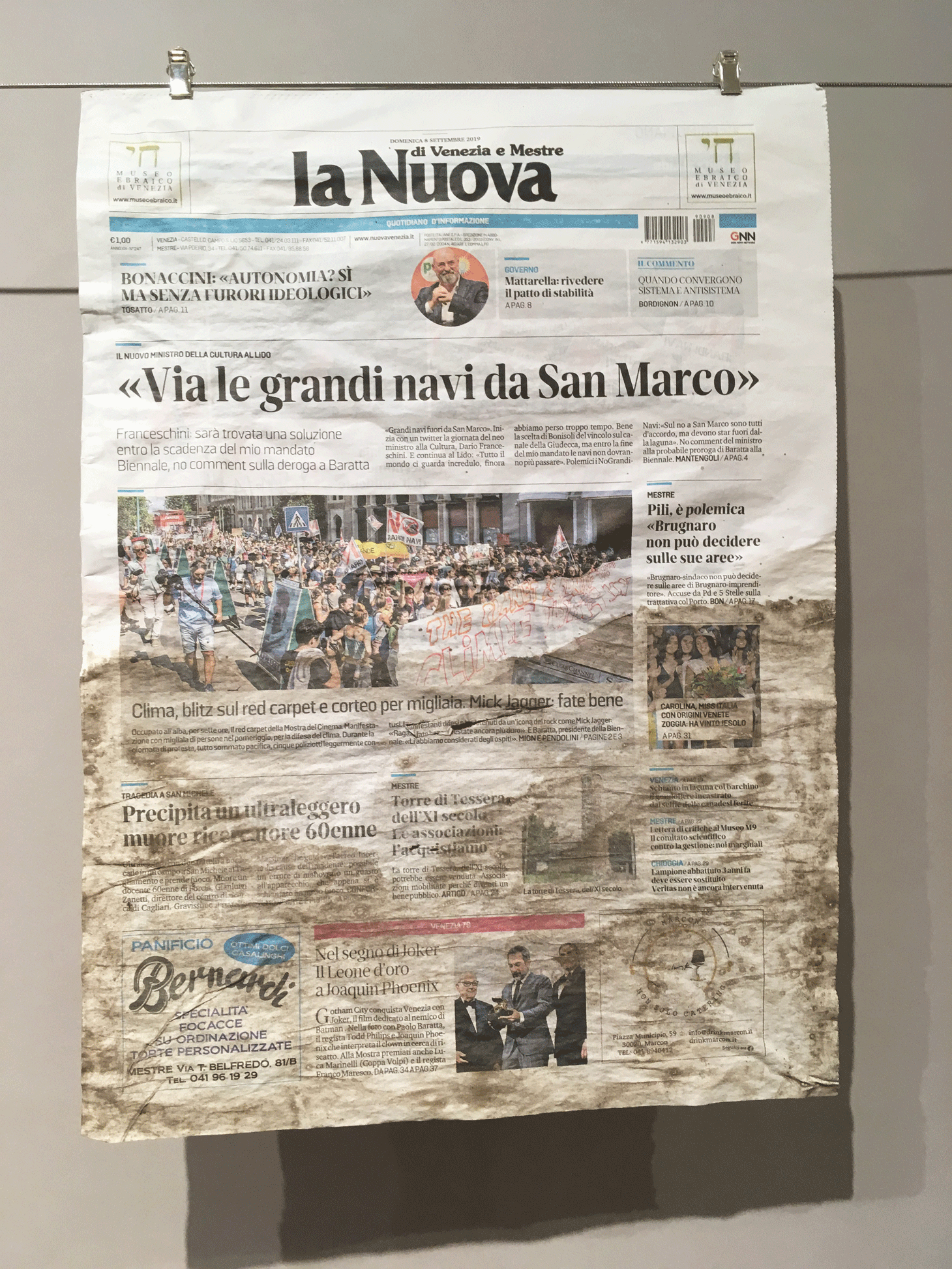 More than 250 news outlets from North and South America, Europe, Africa, and Asia have joined CJR and the Nation’s Covering Climate Now initiative. “For years, most of the American media has failed to adequately cover the most urgent issue of our time,” CJR writes in the exhibition materials. “We need to change the way we report about the climate, and we need to do it today,” it continues. By soiling and deforming newspaper front pages, CJR hopes to speak to journalists in a language they understand.