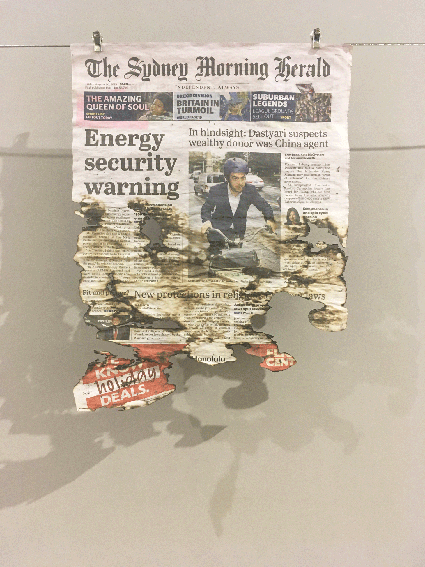 As opposed to other works, which were treated with dyes and other materials to simulate the effect of rising temperatures, the Sydney Morning Herald’s front page was literally burned, leaving only the top headlines unharmed. In 2009, 180 people died in an explosive outbreak of bushfire in Australia’s state of Victoria. The lethal combination of rising temperatures and dry conditions are only expected to worsen in the country’s east and south. In 2013, Australia had to add a new color (purple) to its weather maps for representing unprecedented blistering heat. Government studies project up to a 9-degree Fahrenheit rise in average temperatures in the country by late in the century.