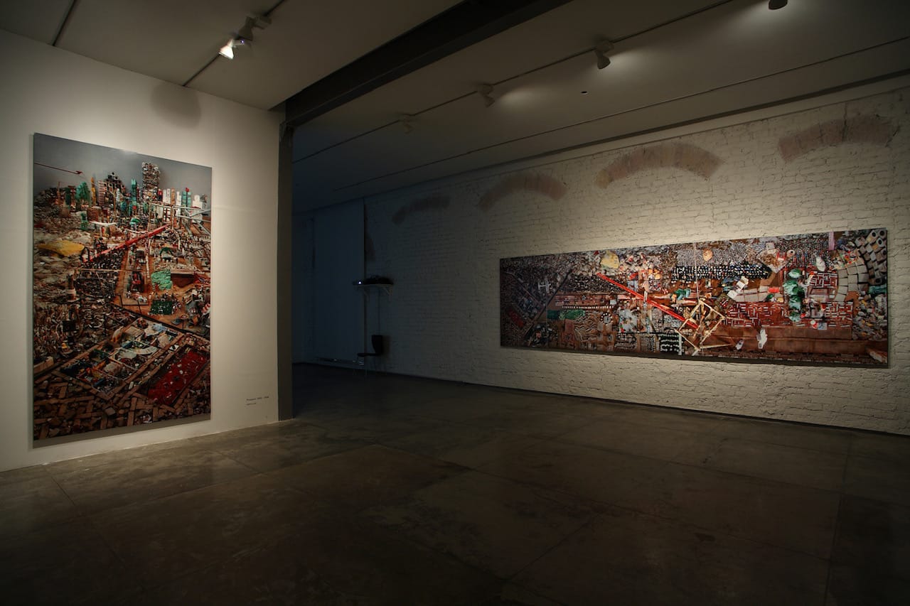 It was only in the early ’90s that Sundaram began to fold more unconventional materials into his practice. While addressing the Gulf War, the artist began coupling slicks of engine oil with charcoal mark-making in a namesake series consisting of 40 works that sat at the triangular intersection between drawing, painting, and installation. This material transition unlocked Sundaram's interdisciplinary interests in combining film, photography, collage, printmaking, and sculpture throughout his practice, culminating in mixed-media installation exhibitions such as Collaboration/Combines (1992), Memorial (1993), and House/Boat (1994). Sundaram's practice continued to respond to current events and persisting injustices through the use of archival information and upcycled materials pertaining to his subjects of exploration. 12 Bed Ward (2005) delved into the stories and practices of India's waste collectors through the use of worn shoe soles and rusted cot frames, an interest that was further explored in Trash (2008).