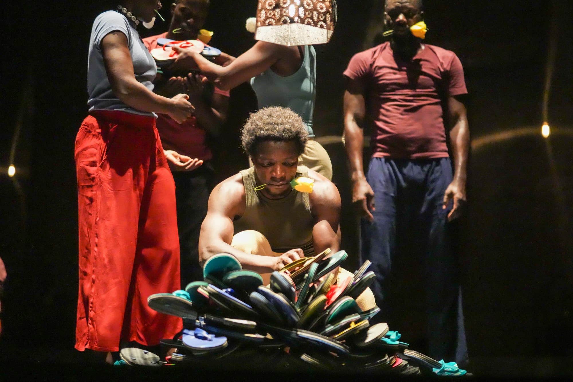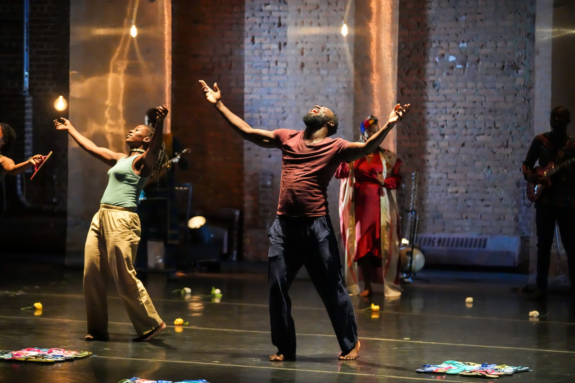 The men launched their bundles upward and, in a sudden burst, flip-flops rained onto the floor. The shoes became a fixture of the performance: at various moments, dancers stacked, balanced, tossed, threw, cursed, and prayed at them. The shoes evoke the unmistakable iconography of mass death, a weighty reminder of the absence and loss of those who might have filled them.