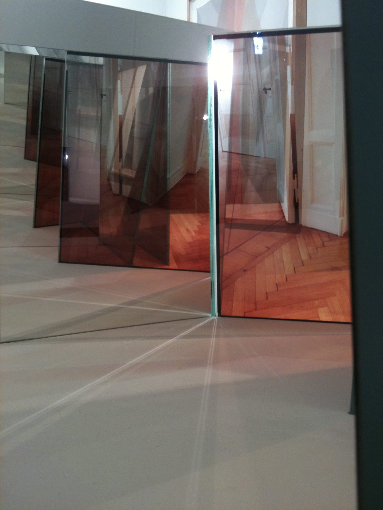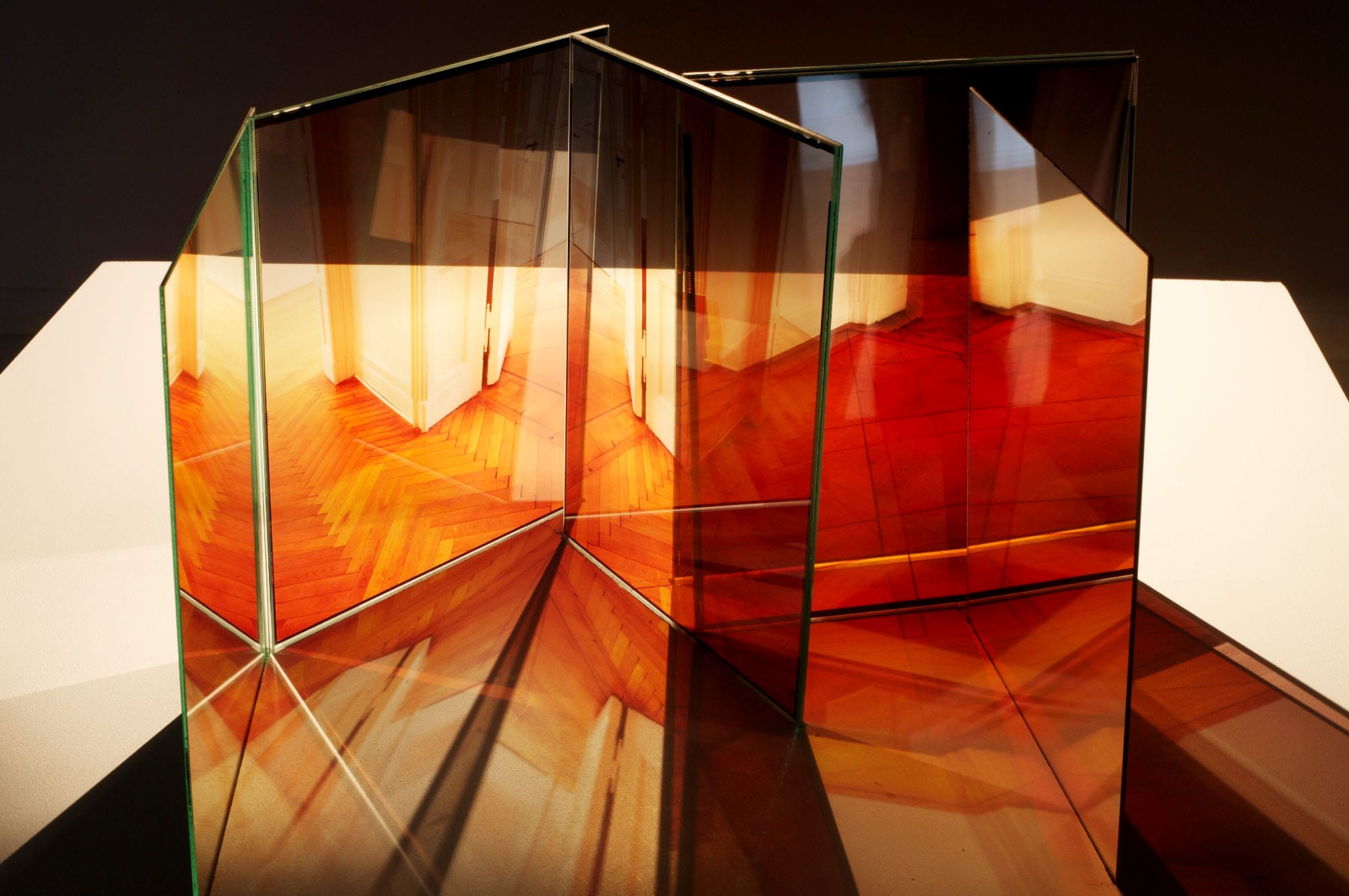 Nettie Horn, London, selected Berlin-based artist Sinta Werner, whose dizzying sculptural installations simulate the effect of approaching a mirror from a single point of view, yet are three-dimensional stage sets, not mirrors. Photographing these illusions is extremely difficult because in reproduction they appear to be nothing but wall-size mirrors. The artist takes on this problem for her solo presentation at Volta by creating a series of three-dimensional vignettes, where transparent photographs of interiors are paired with mirrors of the same size, and arranged, tilted against one another, to create a mise en abyme (placing into infinity). The photographs of interior spaces are joined together in their own reflections on into infinity.