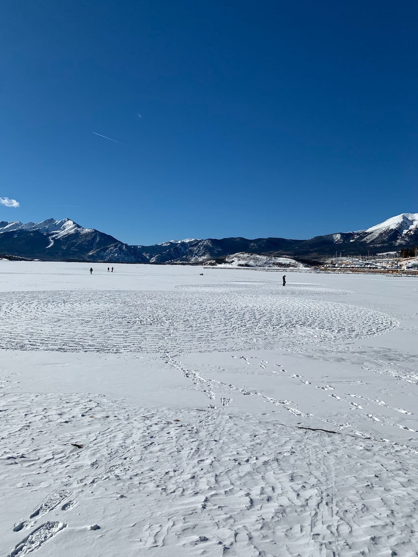We stopped by while Beck was “drawing” on Lake Dillon, a large and thankfully very frozen lake. Beck had already stamped out 41 circles of varying size, arranged in five arms that spiraled out across the lake and came together at a central point.