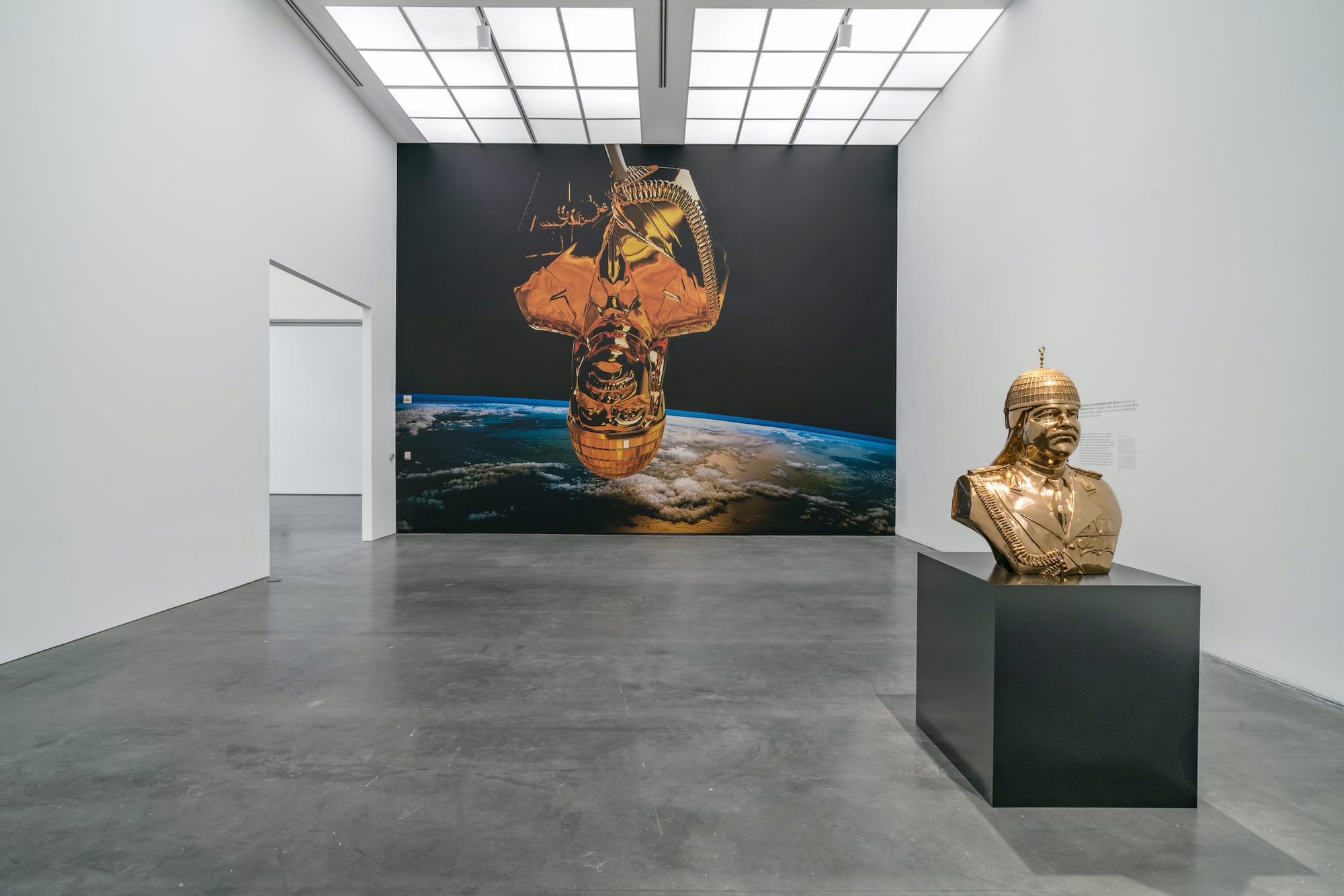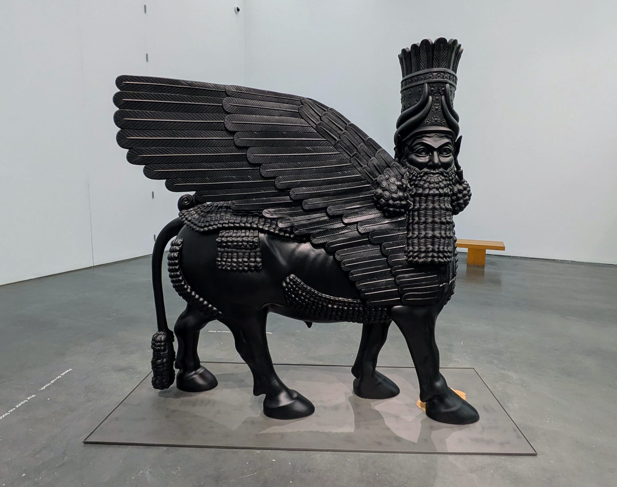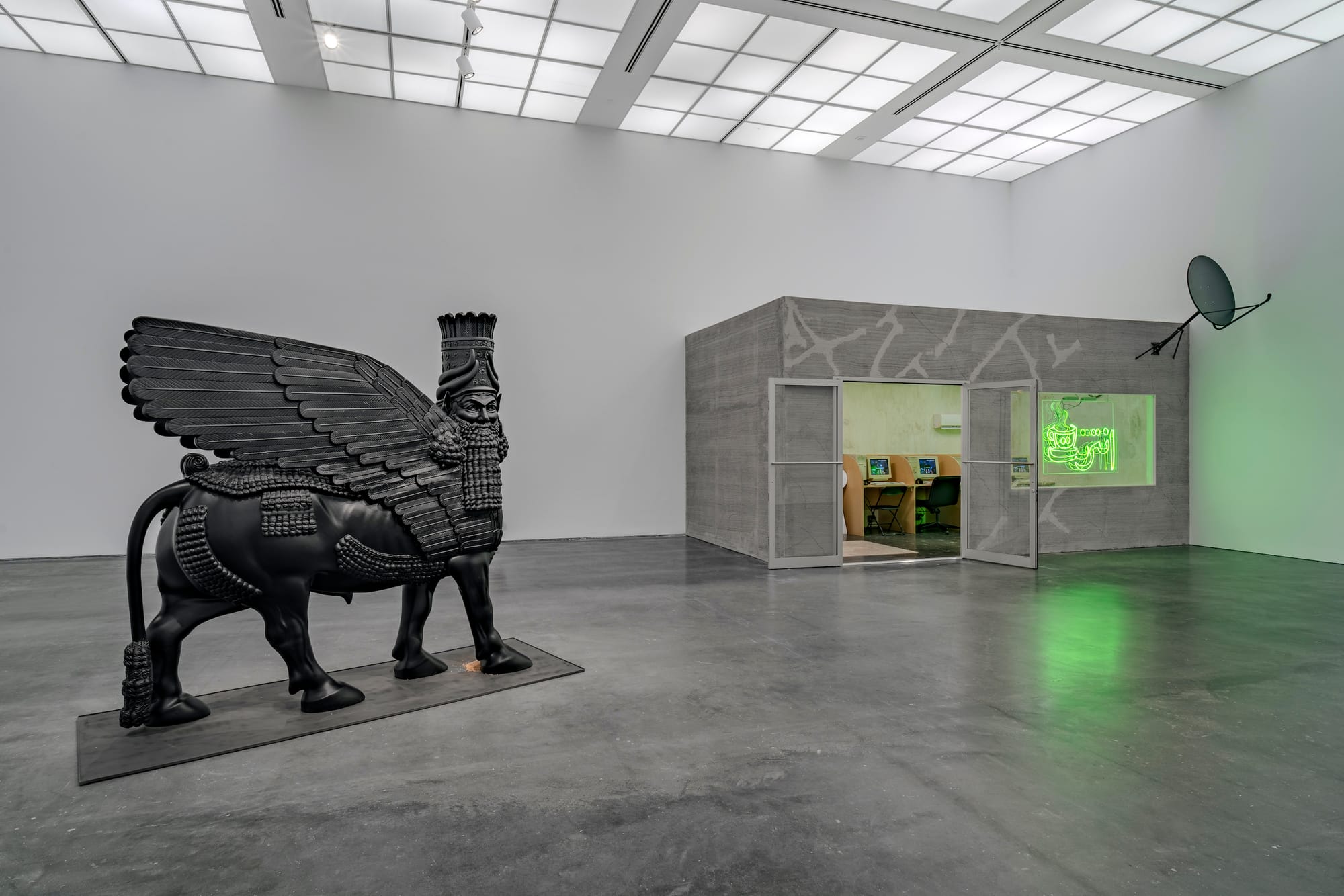 The latest project on view, “In a Grain of Wheat,” exhibits Bilal’s persistent concern with the technological mediation of contemporary culture. Responding to the destruction of Iraqi cultural heritage by ISIS, the artist collaborated with a scientist and coder team to scan the Metropolitan Museum of Art’s lamassu and write its form into the DNA of a grain of wheat. The specific mechanics of this process are not comprehensible via the minimal didactics presented, so viewers must accept that the sculpture lives in the wheat as an act of faith in the art and science of the project. Aptly, the work demands a devotional gesture. To partake of the wheat, one must bend down before the replica winged bull to reach for the pile of seeds at its hooves. More than two decades after the American invasion of Iraq, to see mostly young non-Arab Americans readily perform this gesture of supplication to an iconic symbol of Iraqi cultural heritage makes me think that perhaps this country has forgotten its devastating entanglement with Iraq after all. Bilal, of course, cannot.