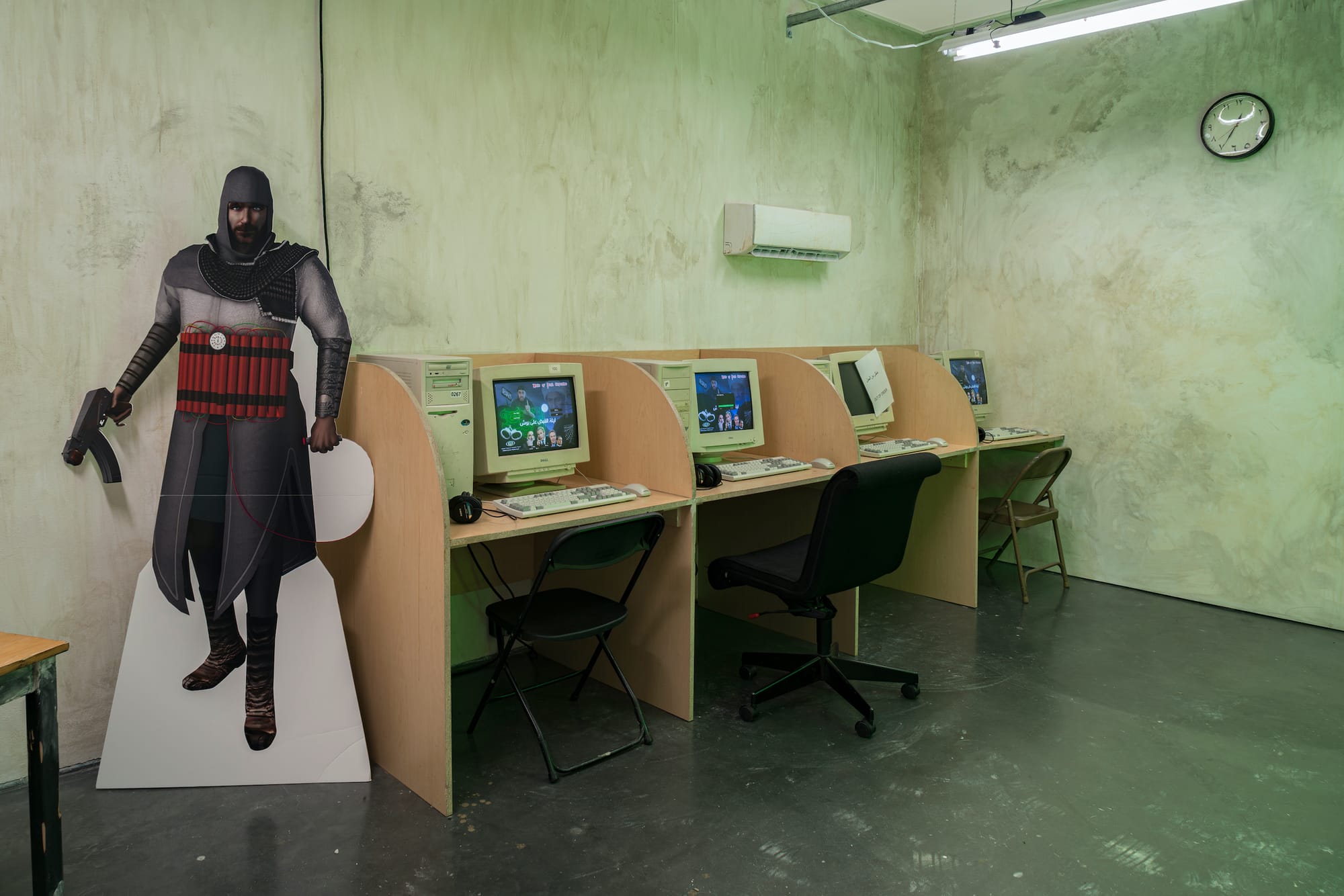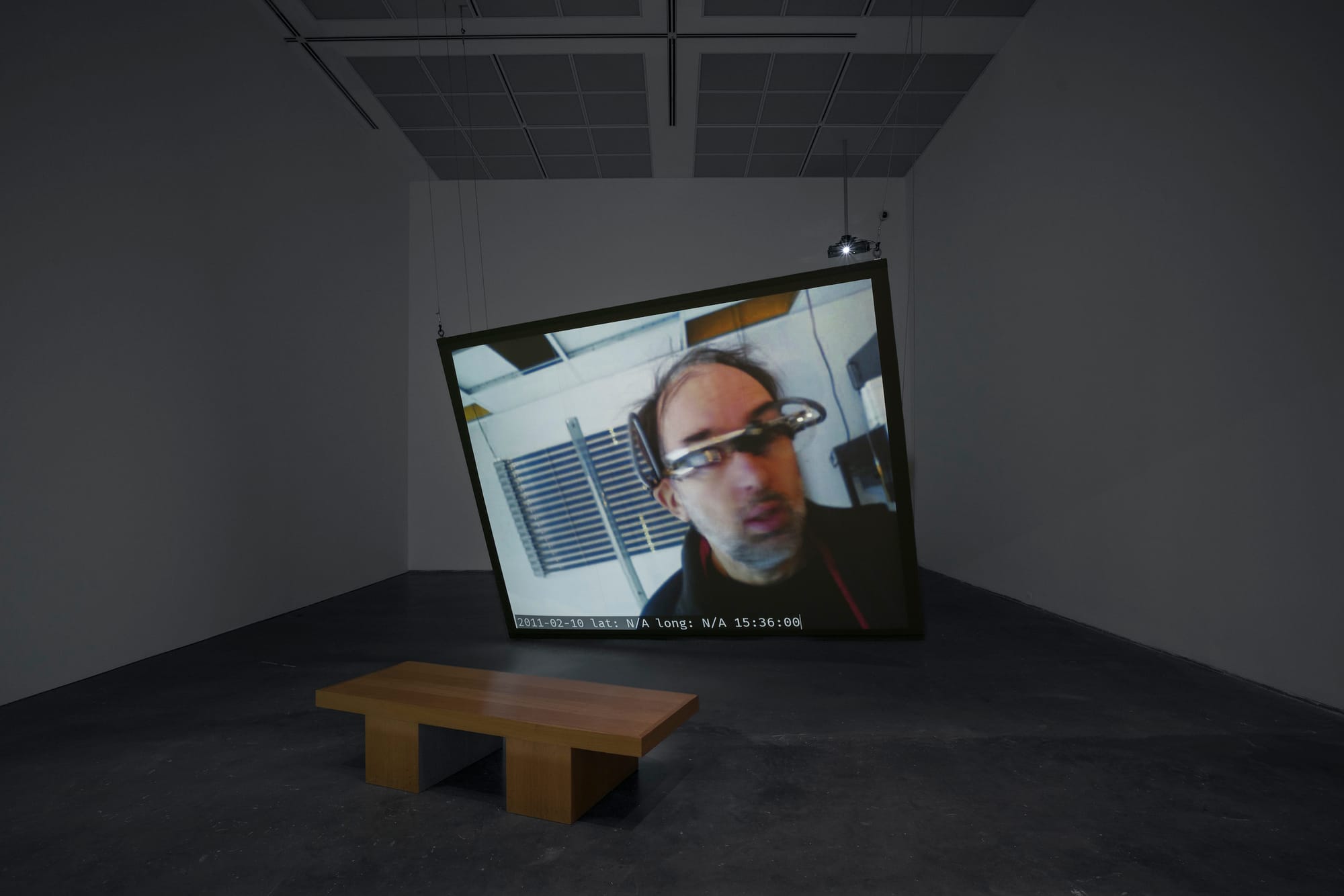 For a significant survey, the exhibition is remarkably spare. Curator Bana Kattan selected five major projects, each one integrating technology, performance, and a conceptual approach to the conditions of being Arab in the United States in the post-9/11 era. In “3rdi,” Bilal surgically implanted a web camera to the back of his head and attached it to an internet-connected laptop slung at his waist. Each minute, the camera would take an image and send it via the laptop to a live website feed. We are privy to an oversized presentation of a year’s worth of these images, projected on a 14-foot scrim diagonally bisecting the gallery and synced to the date and time they were originally taken.
