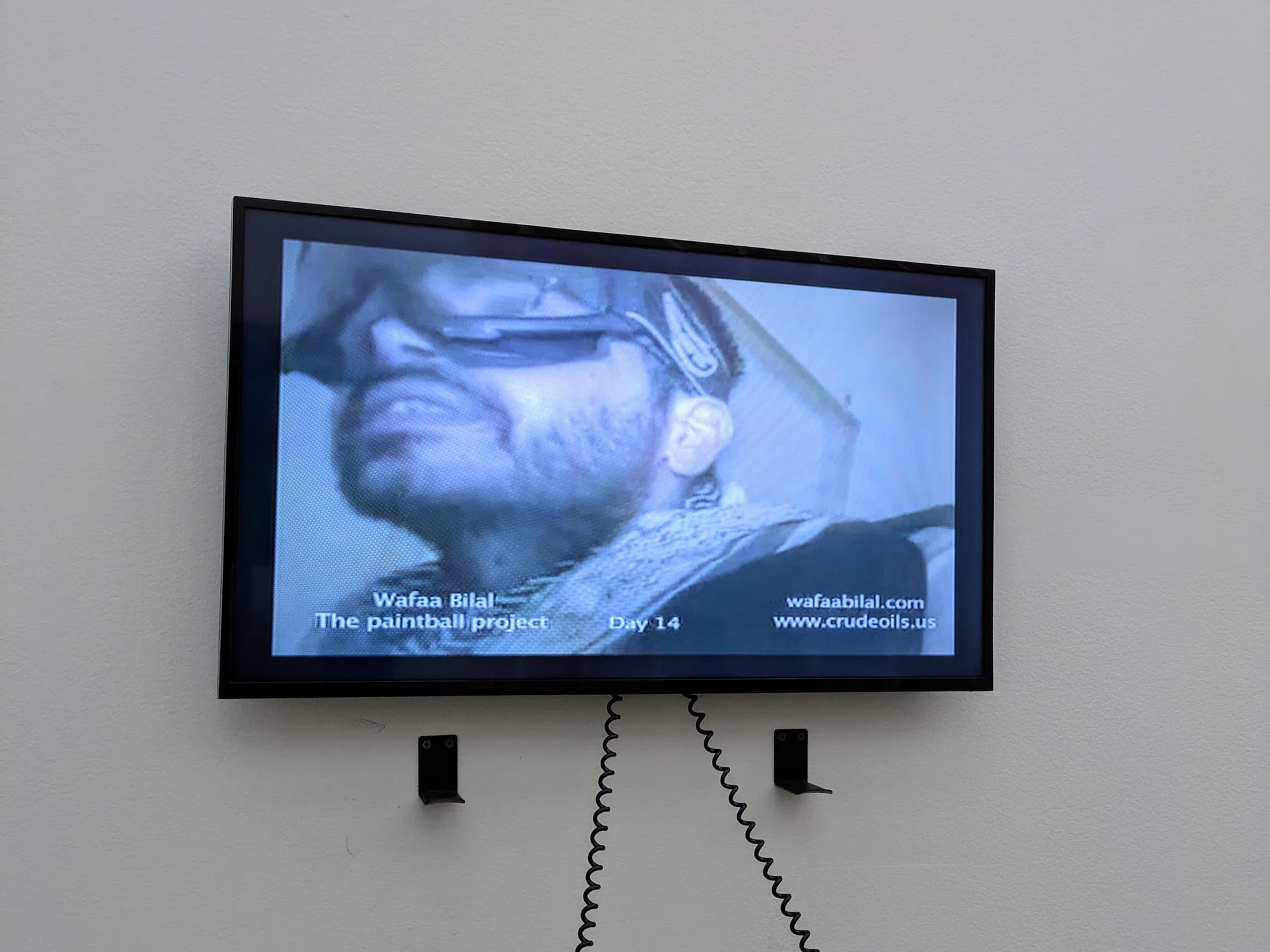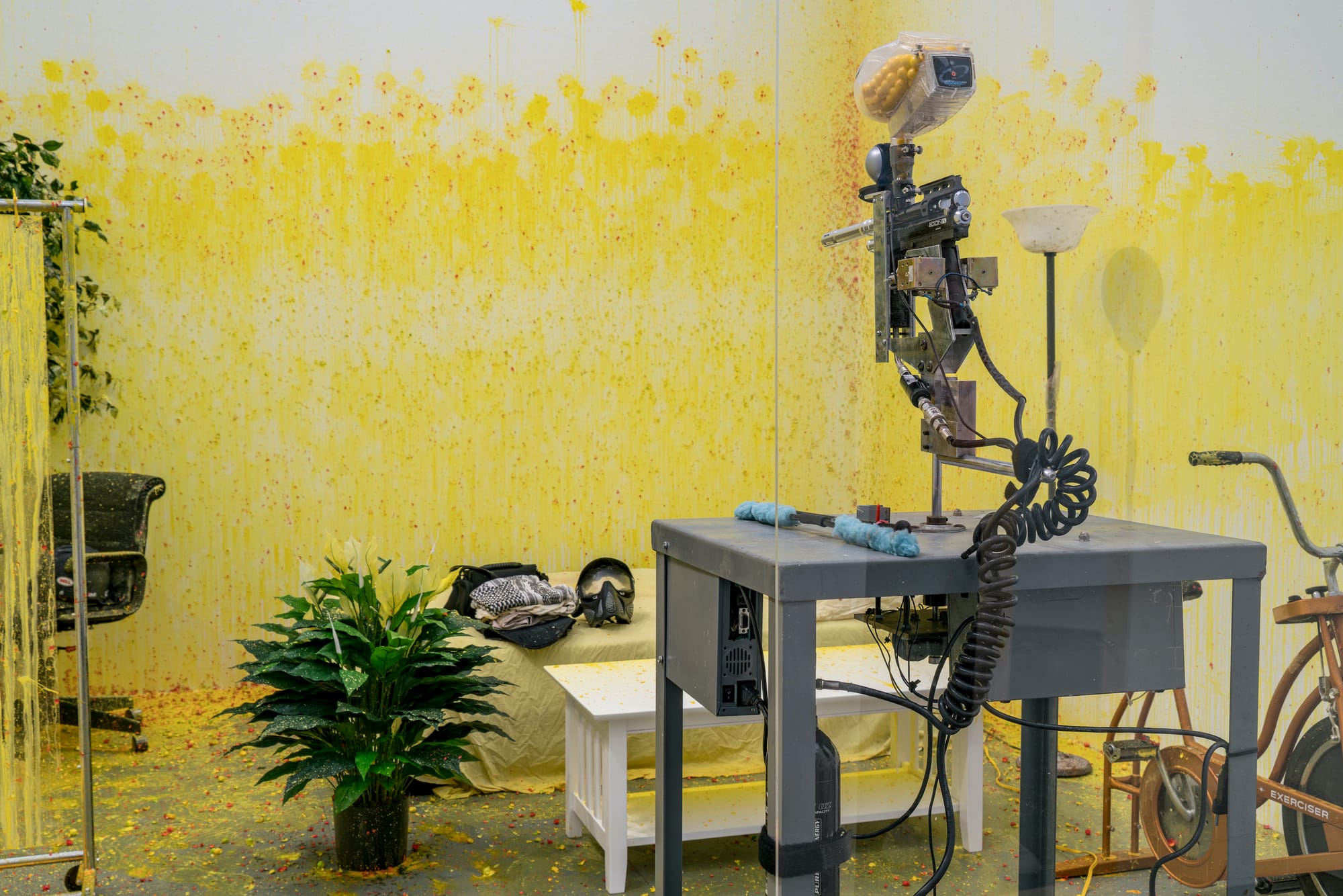 CHICAGO — Though Wafaa Bilal was born in Iraq and is based in New York, his survey at the Museum of Contemporary Art Chicago, Indulge Me, can be called a homecoming of sorts. In 2007, the accomplished yet underrated artist captured the art world’s attention with his durational performance “Domestic Tension,” wherein he lived for 30 days inside the exhibition space of Chicago’s FlatFile Gallery; a web camera broadcast his movements while a paintball gun was available for anyone to remotely fire at him via a website. Reconstructed as an open-face cubicle inside the museum’s pristine gallery space, the splatters of thousands of yellow paintballs on its interior walls do not convey the torturous persistence of the gun as forcefully as the brief video diary screened on a small monitor nearby. In an increasingly distressed voice, the goggled Bilal unironically thanks his audience for their participation as the gun processes a ceaseless string of firing commands.