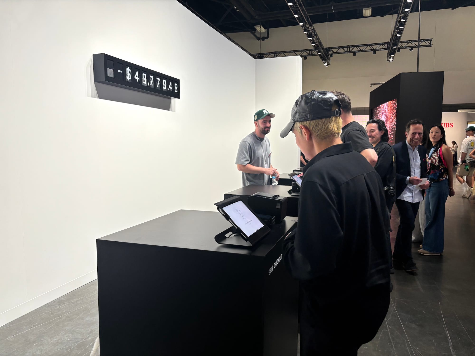 The installation consists of a checkout counter powered by Stripe terminals that beckon visitors to tap their cards and pay any amount, receiving a printed receipt whose length is proportional to their payment and comes with an “NFT companion.” A ticker above the counter tracks the lucre from a starting point of -$75,000, Butcher’s stated investment in the piece. When I informed a man who forked over $37 for a rather short receipt that he could have bought several pastries at the nearby Maman Café with that money, he looked at me like I was the ignorant one, like I was the one who had missed the point. “I have purchased an original artwork,” he told me.