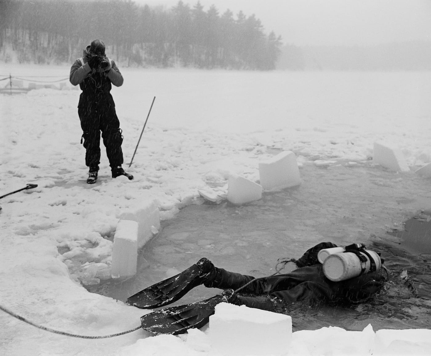 It can be easy to read the photographs as simply a visual degradation of Thoreau’s idyllic pond, of a decay of humanity with glimpses of swimmers on their cellphones and tattoos of Citgo logos. Yet Thoreau’s isolated Walden Pond was something of a fiction, with a train track rattling nearby, and regular visitors to his cabin. Like Walker’s photographs of Polaroid factories being demolished, there is a somber tone in the alterations to the pond over the years, including shots of a bulldozer making way for a highway expansion, and an adjacent landfill. Nevertheless, the pictured human interactions with nature, from state troopers using it for recovery training to a biologist tracking the blooms of flowers, show it as an active place of all seasons. Humans have radically altered this Massachusetts pond, but it is still being experienced as an environment. To borrow a quote from Thoreau, “Things do not change; we change.”