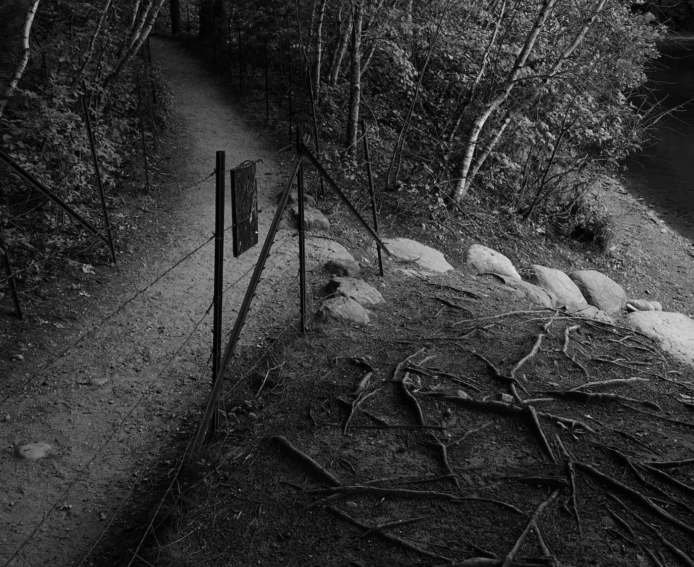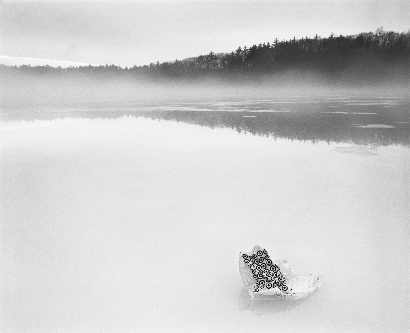 This year is the bicentennial of Thoreau’s birth in 1817. The monograph is out May 16 from Kehrer Verlag, and photographs from the series will be on view May 4 to June 17 at Janet Borden Inc. in Brooklyn. The book avoids contrasting Thoreau’s words with the images of the modern-day site, where literary fans, birdwatchers, fishers, swimmers, and hikers all come to wander the pond’s forested shores. Aside from one Thoreau quote at the beginning (his 1840 list of paradoxes, such as “The highest condition of art is artlessness” and “He who resists not at all will never surrender”), the American author is verbally absent. Yet he is the reason this place has such national resonance, and thus he haunts each frame, whether the curve of a path bordered by barbed wire recalling his walks in search of solitude, or a beautiful image of his beloved pond in winter interrupted by a Target bag.