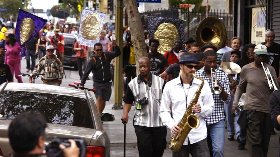 LOS ANGELES — By the time the COVID-19 pandemic forced Los Angeles into lockdown, plans for Walk the Talk — the biannual parade celebrating community activists in Los Angeles’s Skid Row neighborhood — were well underway. The event is organized by the Los Angeles Poverty Department, or LAPD (an intentional allusion to the Los Angeles Police Department), a nonprofit performance group composed of housed and unhoused Skid Row residents. It features a New Orleans-style brass band, public art projects, and performances by LAPD members. Each year it honors eight activists (with the exception of 2012’s inaugural event, which honored 36), who have contributed to improving the neighborhood and strengthening its community. Honorees range from civil rights and housing advocates to mission leaders, local merchants, and artists, who work and, in many cases, live in Skid Row.