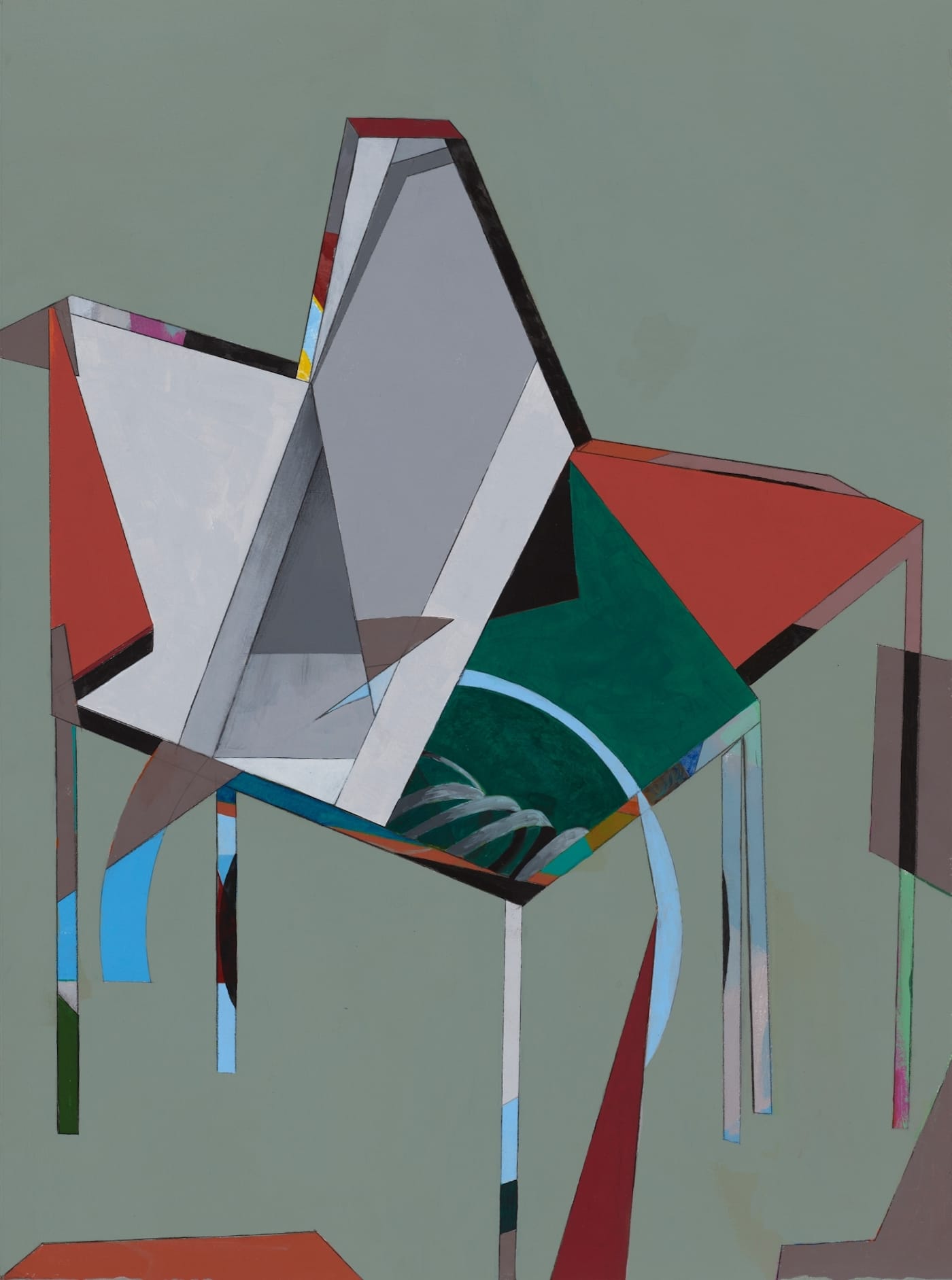 Another thing that struck me about the works in this exhibition was how different they were from each other, even as Lum used some of the same materials. The painting on paper “Endless Fall 3” (2021, acrylic on paper, 30 by 22 inches) depicts what could be a table with a large, planar, abstract object on it, or a geometric sculpture with six legs, and shares something with the work of Thomas Scheibitz, whose lexicon also nimbly dances between two- and three-dimensionality.