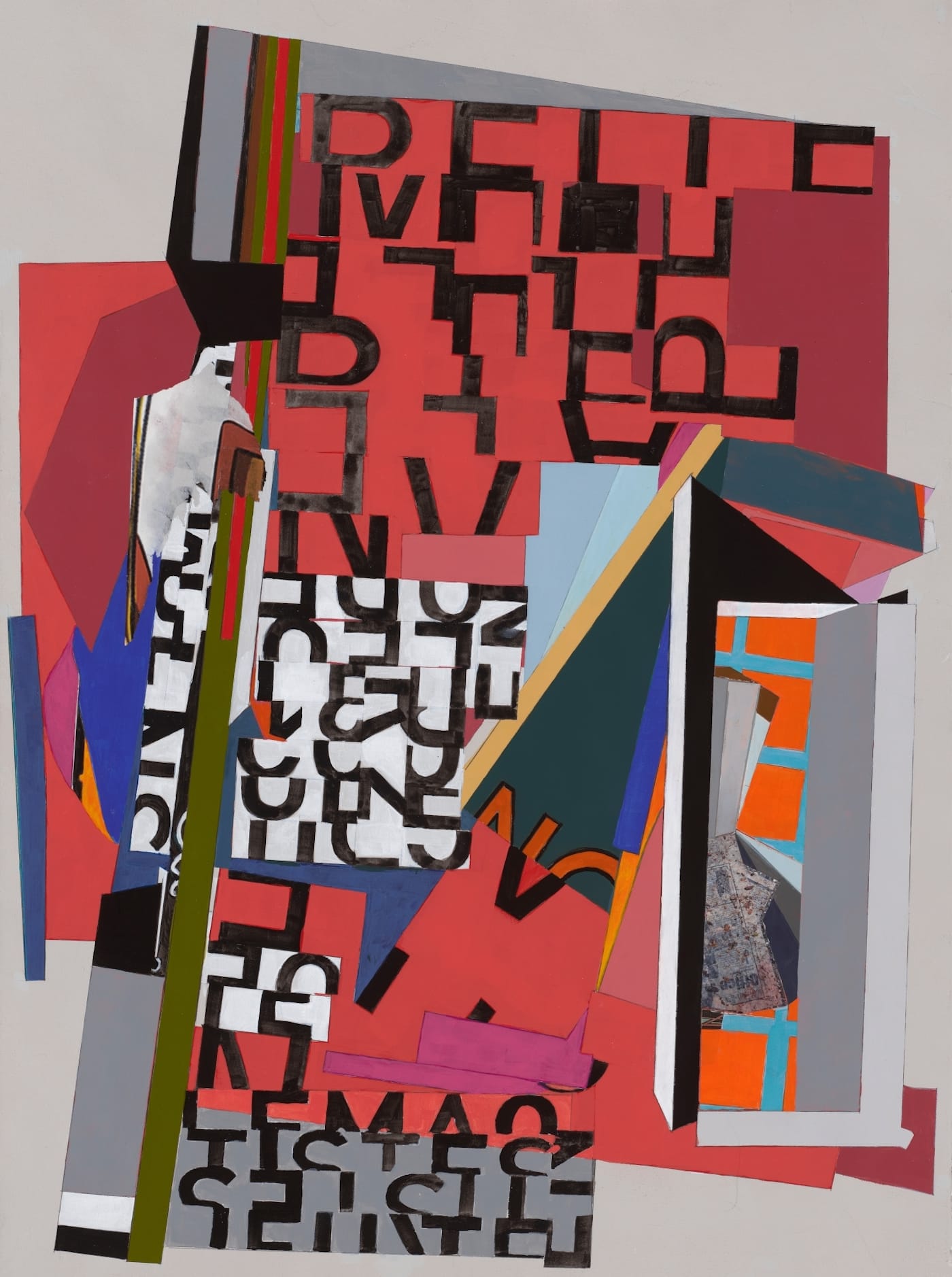 In “Poster” (2021, acrylic, found paper, and photo collage on paper, 30 by 22 inches), the clusters of asemic letters are on the cusp of legibility, and a spatial cul-de-sac is visible on the right. I am reminded of that moment in a foreign city when you realize the signs are beyond your comprehension, and yet that is not really what is going on in this work. If all art aspires to the condition of music (which is a state of abstraction), as Walter Pater said, “Poster” achieves that state while having one foot in the referential world.