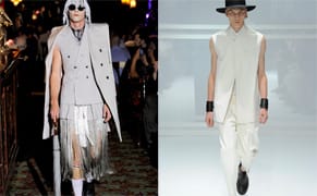 A conventional blurring of gender lines — a mainstay in men’s fashion — reared its head this year again, from the faux-Polynesian prints at Kenzo to the high-heeled boys at DSquared 2 ripped straight out of Lady Gaga’s “Alejandro” video. Male models sported skirts in a number of shows, notably Lanvin and Rick Owens. Famed fashion journalist Suzy Menkes tackles this ubiquitous, unpopular trend in an article for The International Herald Tribune and offers an explanation other than tired scandalizing: