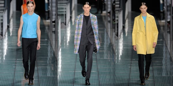 Raf Simons, who says in another life he would have been an architect, created robust shapes and stark silhouettes, nicely emphasized in some pieces with pale pastels or linear plaids. The A-line topcoats in particular have a hammer-and-nailed together look (you get the feeling that they could stand upright on their own accord), but don’t seem overworked. Adding a bit of an edge, he included leather tank tops with zipper epaulets, which looked perfectly cast and molded to his skinny models’ torsos. Though the Brady Bunch florals off-put the pristine lines and masculine angularity, almost the entire collection reads as a kinetic sculpture show, with each model looking like a walking statue.
