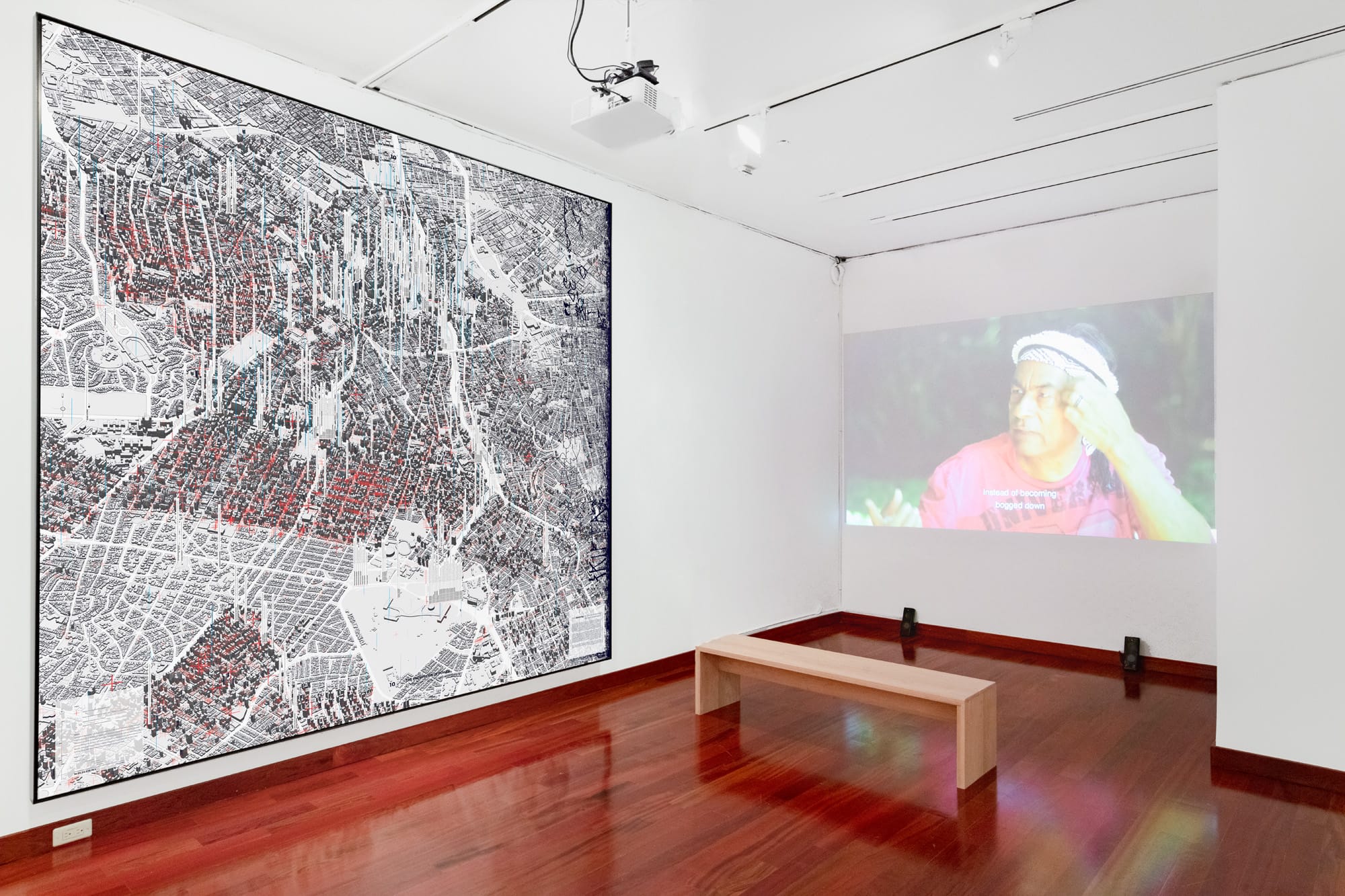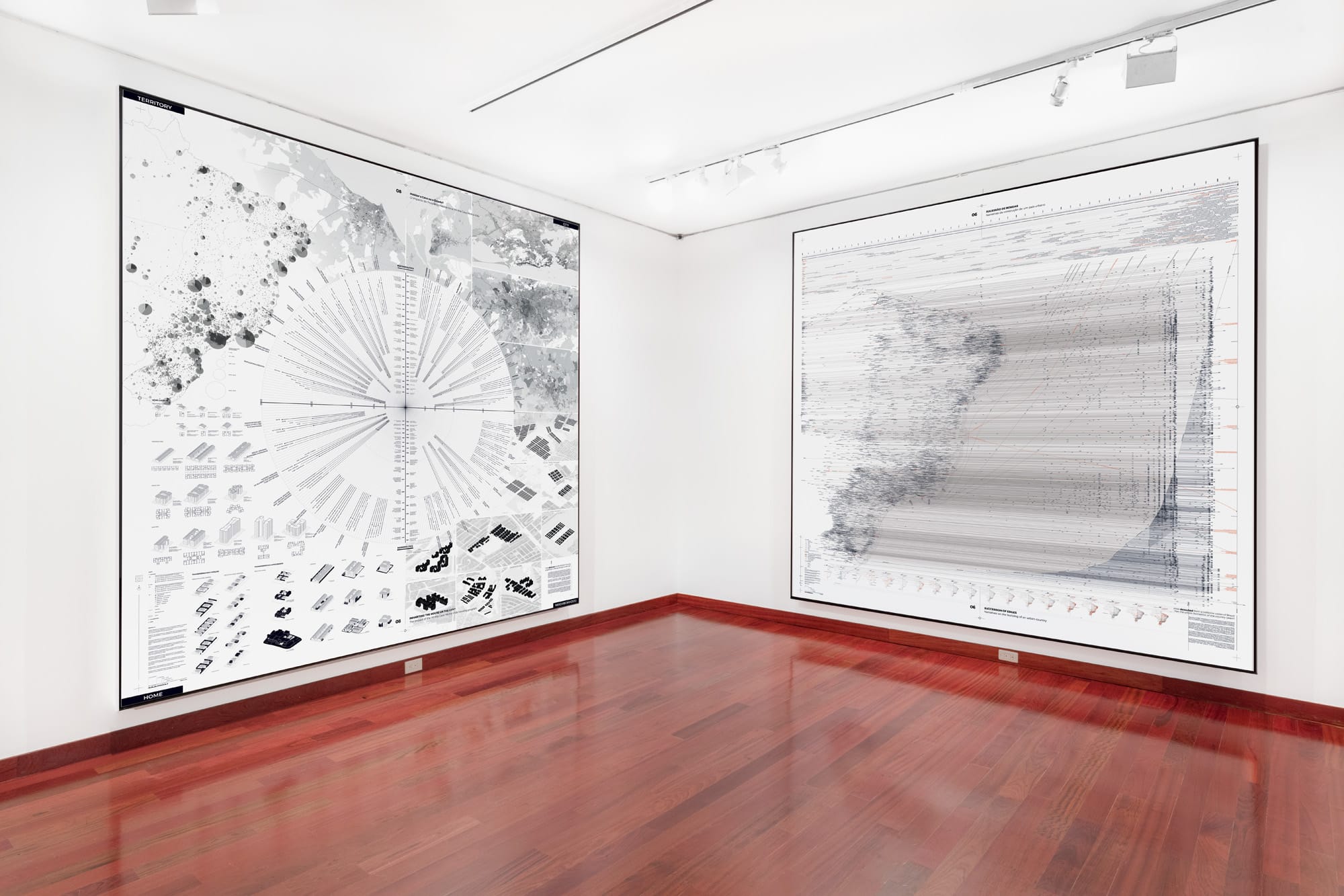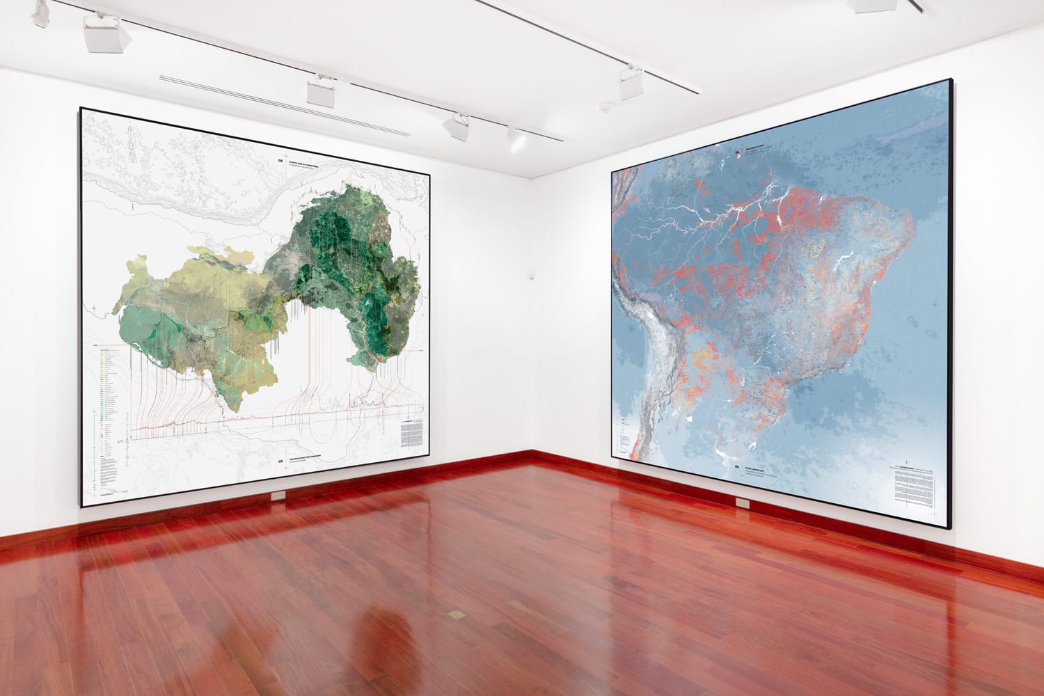 In a video about the exhibition, Kozlowski asks “What prevents Brazil from being free?” To answer this question, Walls of Air’s cartographies elucidate both literal and metaphorical walls that limit equality and freedom in Brazilian society and Latin America at large. The massive size of the maps magnifies their details, allowing onlookers to take in the depth of information on display.