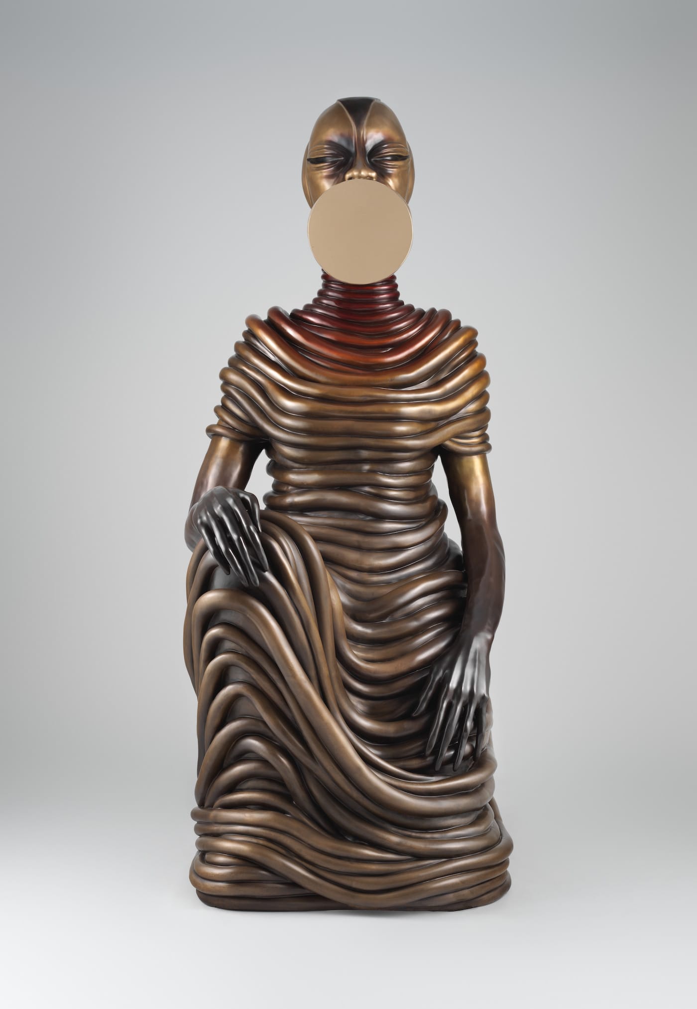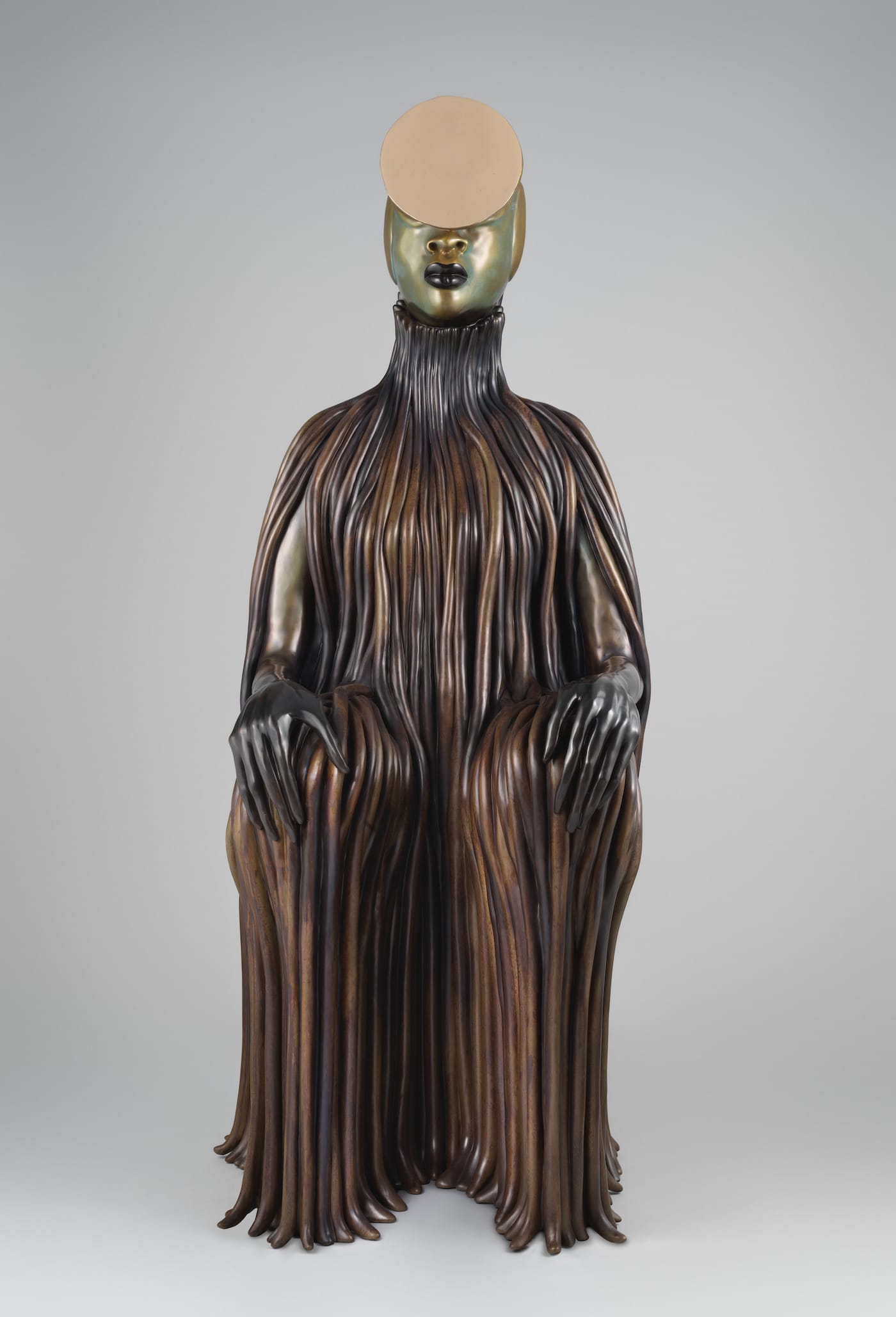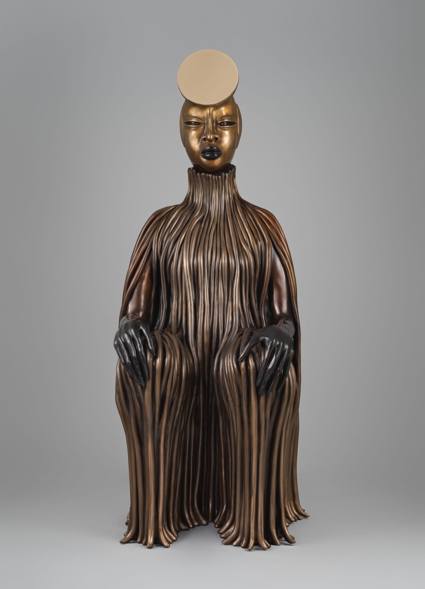 Accordingly, “The Seated,” as they are individually called, balance their roles as emblems and avatars of female empowerment. Compared to the massive scale of the Met’s façade, they are relatively small and overshadowed by the pair of columns surrounding each niche. If Mutu’s sculptures weren’t of such exceptional quality, one might worry about the artworks being swallowed whole by the museum’s mammoth exterior. Fortunately, the brilliant details of each statue attract the eye. Each statue followed a prescribed pattern, with minor variations between them. All include a polished disk placed somewhere on the figure’s head, which is reminiscent of the circular lip plates traditionally worn by peoples in Ethiopia, Sudan, and the Americas. Each also wears a garment inspired by the neck rings found in some African and Asian cultures where such jewelry amplifies the wearer’s majesty and might.