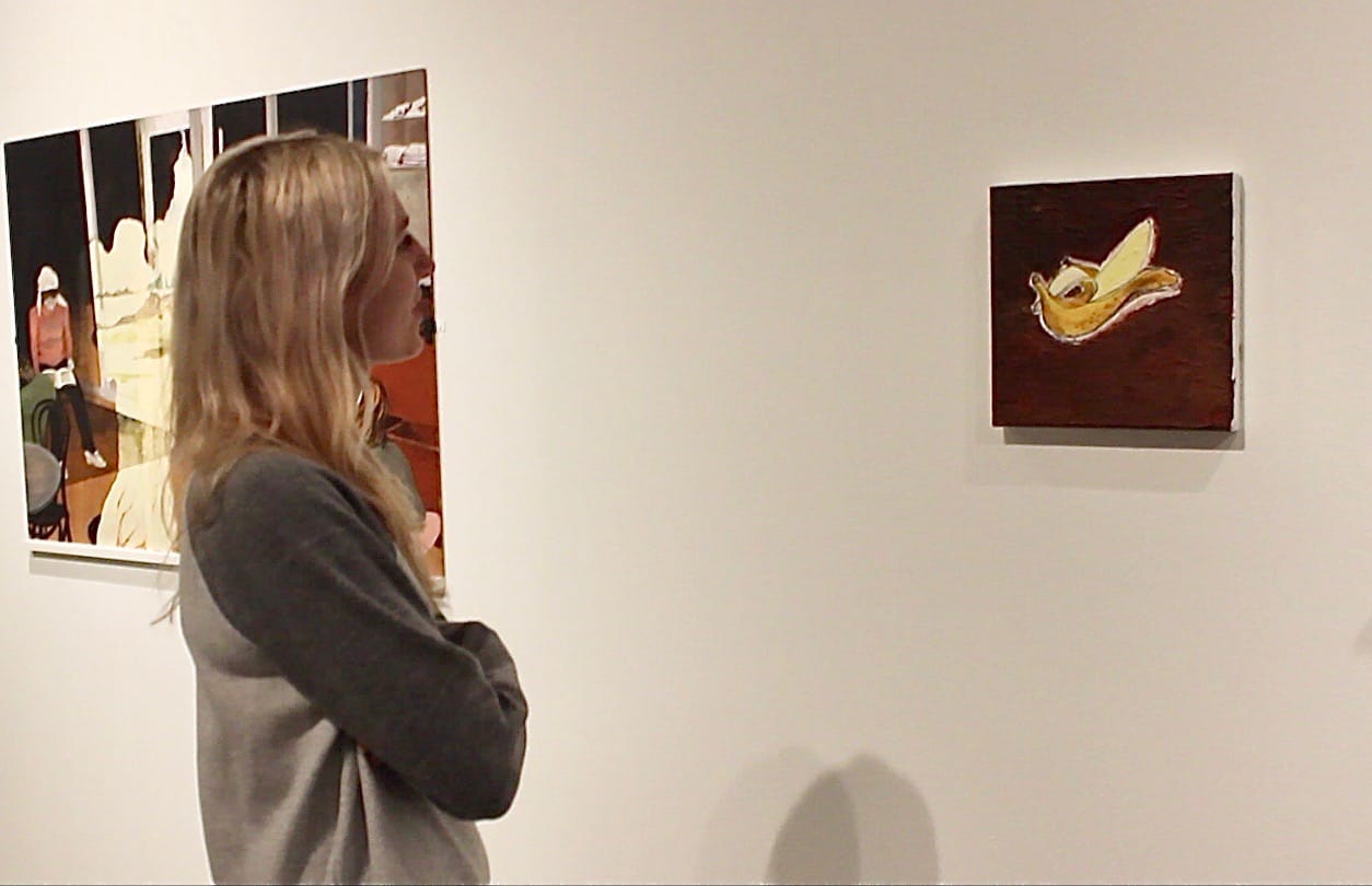 The plot consisted of inserting a Banksy painting of a plain, half-peeled banana which matches the style and palette of the adjacent paintings displayed in the Mamma Andersson: Memory Banks exhibition currently on view. According to Frizk, he successfully recruited two University of Cincinnati students to distract a security guard and snuck the painting in and hung it before others became aware. However, it didn’t take very long for other museum staff to notice that the painting was not Andersson’s work and promptly take it down. According to the center’s communications director, Joshua Mattie: