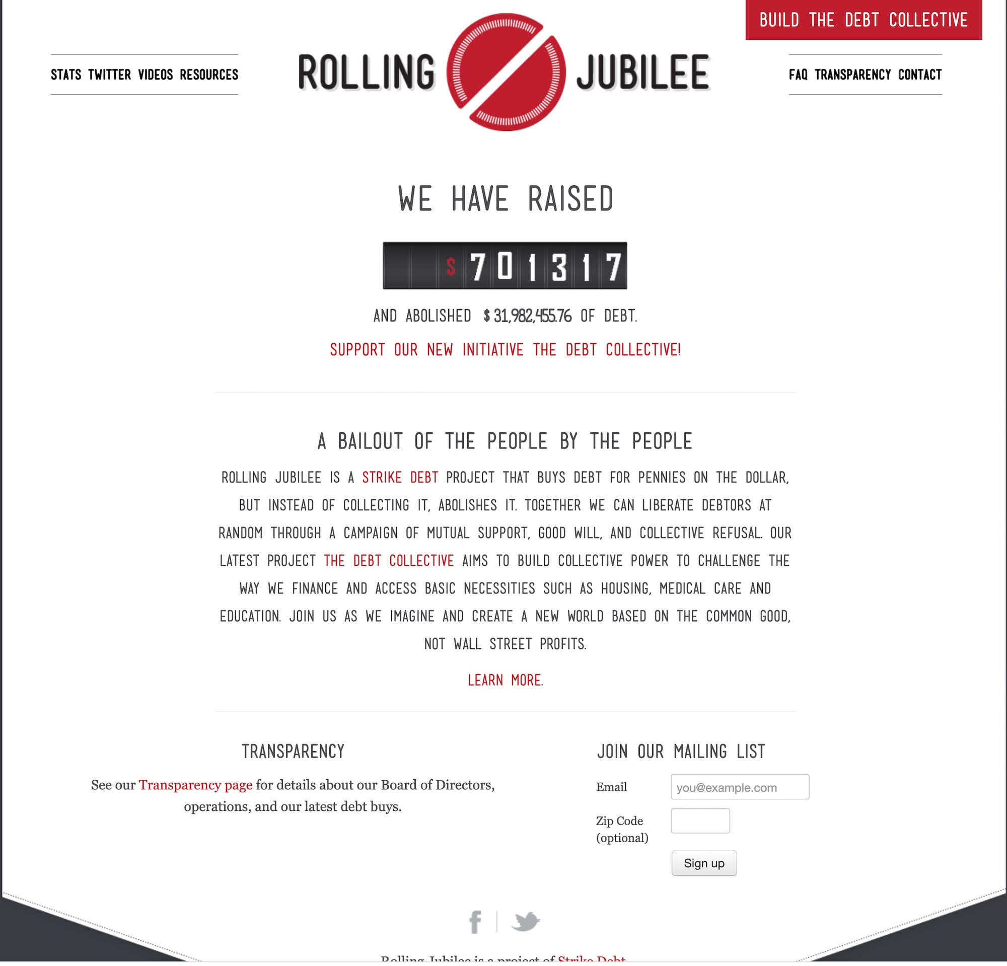 Perhaps the best known such attempt came from activists allied to Occupy Wall Street who realized that many were in some way artists, and most were deeply in debt. Strike Debt emerged as a platform for creative resistance which first tried to organize a coordinated boycott of repayment of student debt. This is a tactic they soon abandoned but is today being very successfully mobilized by a subsequent group involving many of the same members: the Debt Collective. In 2012 Strike Debt found a way to use Wall Street’s own tools to crowdfund a war chest to buy up heavily discounted sub-prime medical debt for pennies on the dollar and simply forgive it. Strike Debt never presumed their tactic, the Rolling Jubilee, would eliminate all debt. (Ironically, they were helping create a market for such derelict debts, driving up the price.) Their actions, like many participatory art interventions in recent years, aimed to rupture the way society imagines debt, money, and power and offer a taste of the kind of solidarity that, if embraced, might make radical change possible. This inspiring tactic has also led to a recent efforts in the UK under the banner of The Bank Job, which culminated in the performative explosion of an armored bank van.