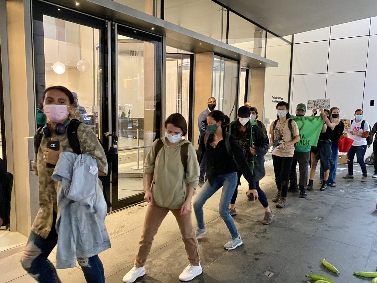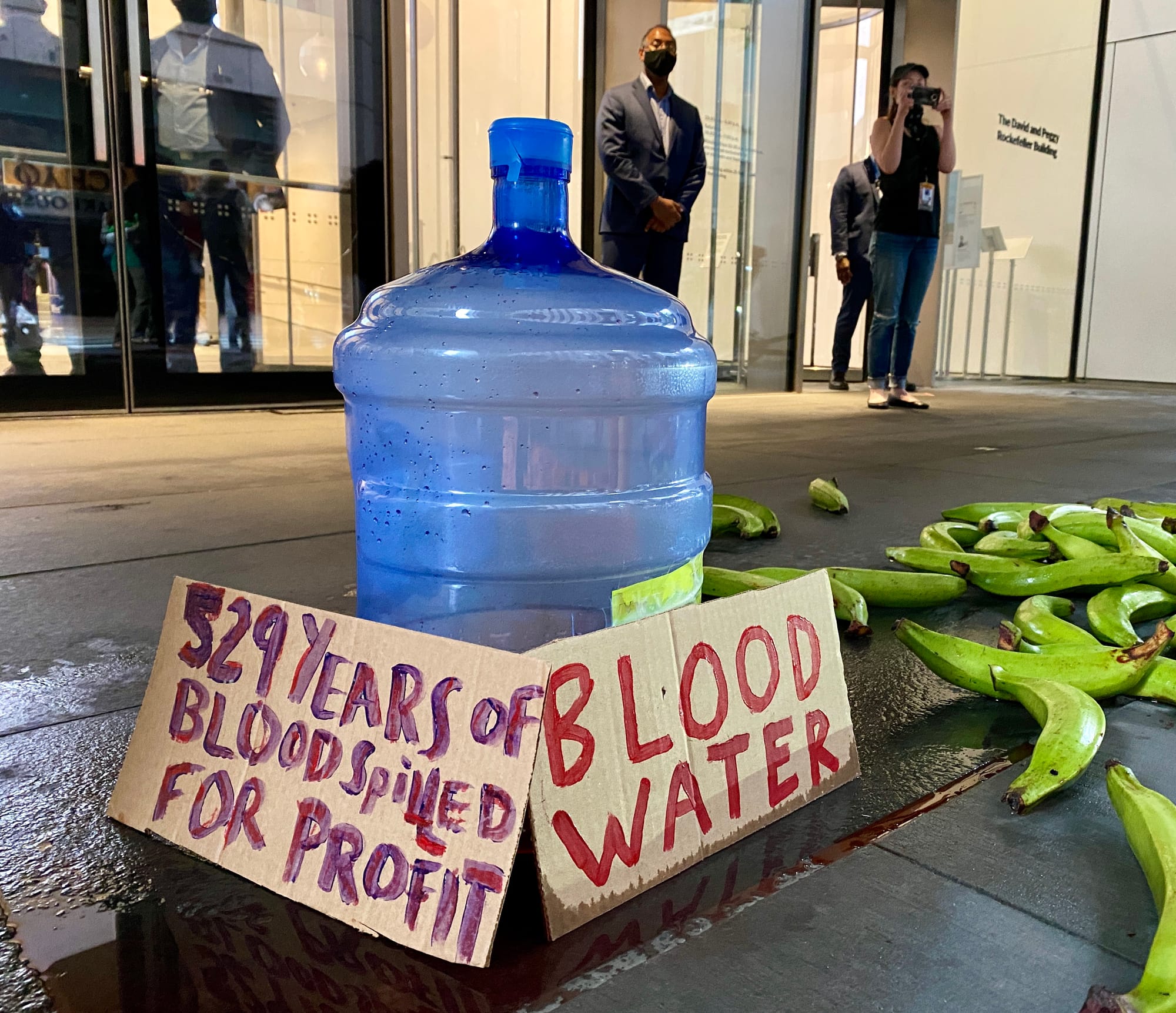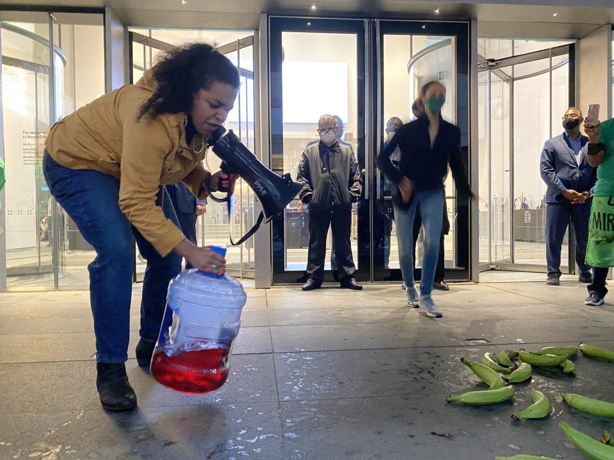 Around 5pm, Placido led the protesters to MoMA's entrance, where they emptied a box of plantains on the floor. They chanted "Out, Out, Barrick Gold" in Spanish and performed a sacred Palo dance in a circle around the scattered fruits. At a climactic moment in the protest, Placido spilled the "blood water" she had prepared earlier onto the plantains while repeating, "They're washing their hands with the blood of our people."