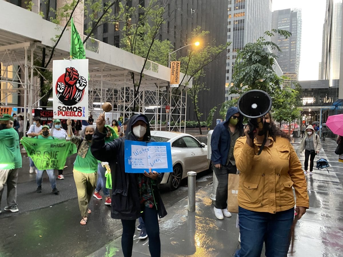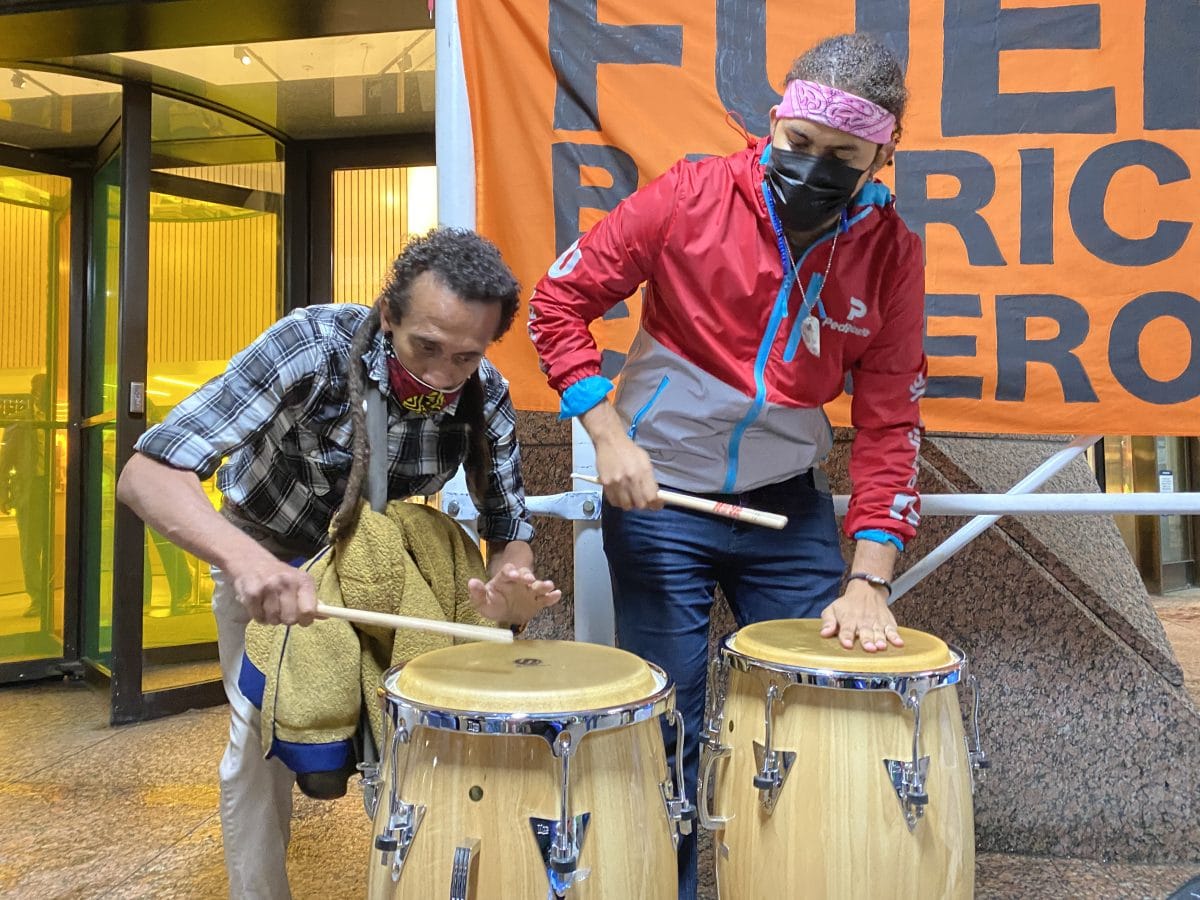 Alternating between Spanish and English, Placido cried through a bullhorn: "Water is a source more precious than gold"; "We were not discovered 529 years ago, we were invaded"; and "MoMA should be ashamed of itself." Roa was on the drums, playing Afro-Caribbean ancestral music with another protester.