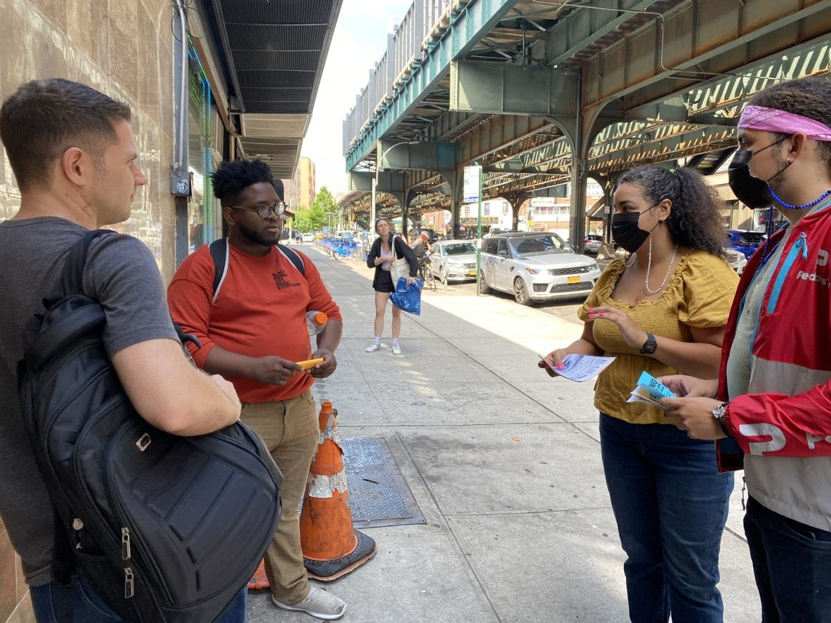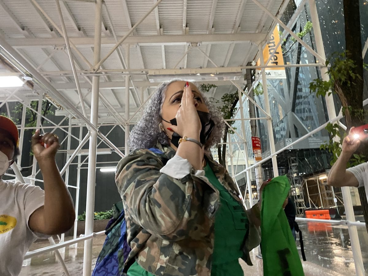 When the two organizers and I arrived at MoMA, heavy rain showers broke, forcing a group of about 35 protesters to shelter beneath a scaffolding around a building across the street. There, Placido and Roa met with an older generation of Dominican immigrants, who have waged similar battles for years.