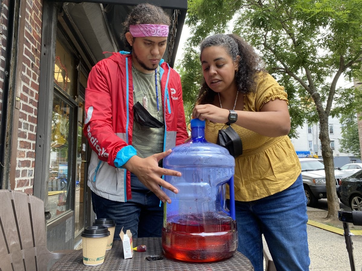 In Astoria, the two activists were pushing a shopping cart filled with books, flyers, protest banners, and one large water jug. In a cafe next to the music store, Placido took the water jug out and mixed in red food dye to create "blood water" which would later be used in the protest to symbolize the "blood spilled for profit."