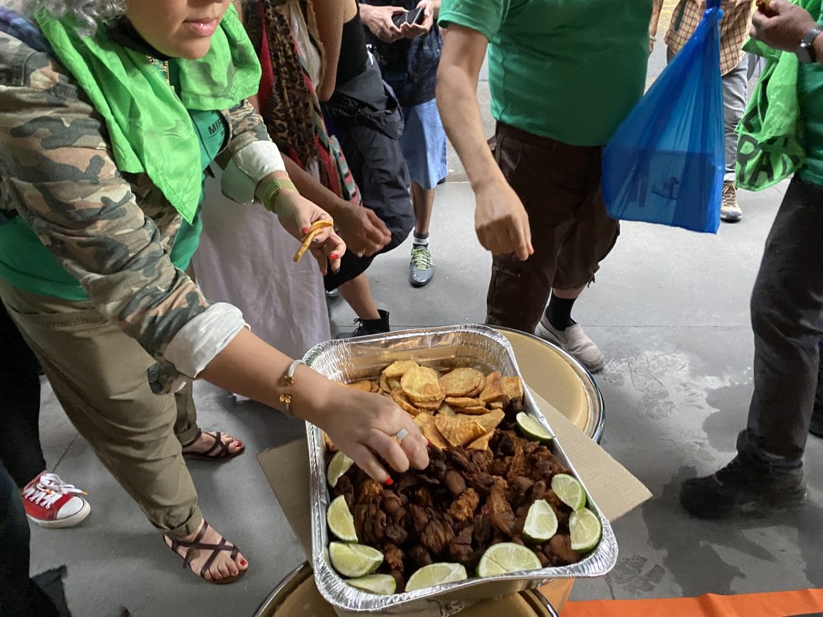 Toward the tail end of the protest, the skies cleared and the weather brightened, and the protest turned into an outdoor celebration. Participants danced to upbeat bachata music and snacked on Caribbean foods (fried plantains, potatoes, and sausage) that were handed out by the organizers.