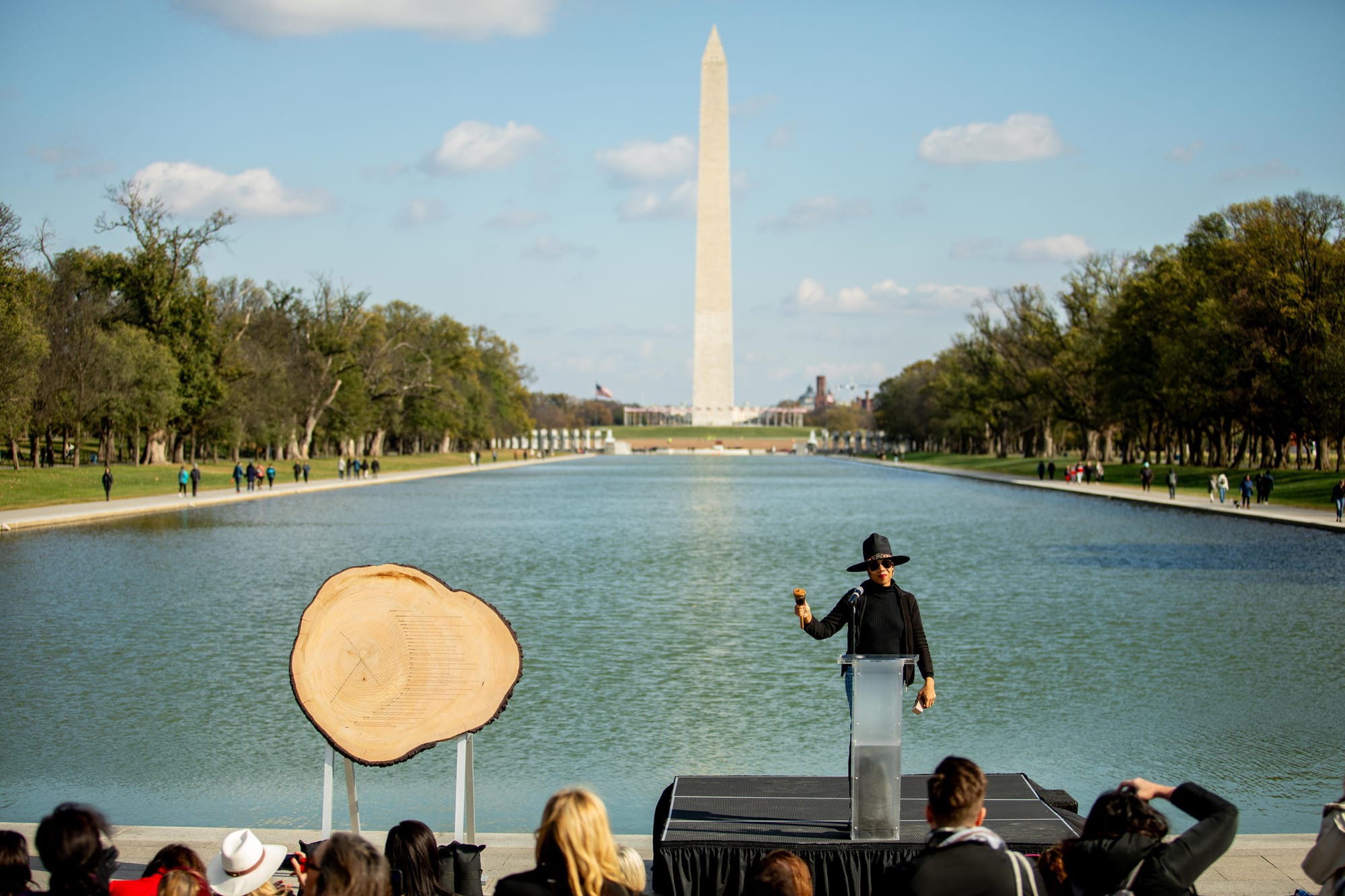 Sponsored by the National Women’s History Museum (NWHM) in partnership with the Women Connect 4 Good Foundation, “DENDROFEMONOLOGY: A Feminist History Tree Ring” by artist Tiffany Shlain stands facing the Lincoln Memorial. The four-day installation is a 65-inch cross-section of a fallen Deodar cedar (meaning no trees were harmed, thankfully) demarcated in the olde-tyme style of national park monuments that chart out the progression of human history against the time logged in the rings of the tree.
