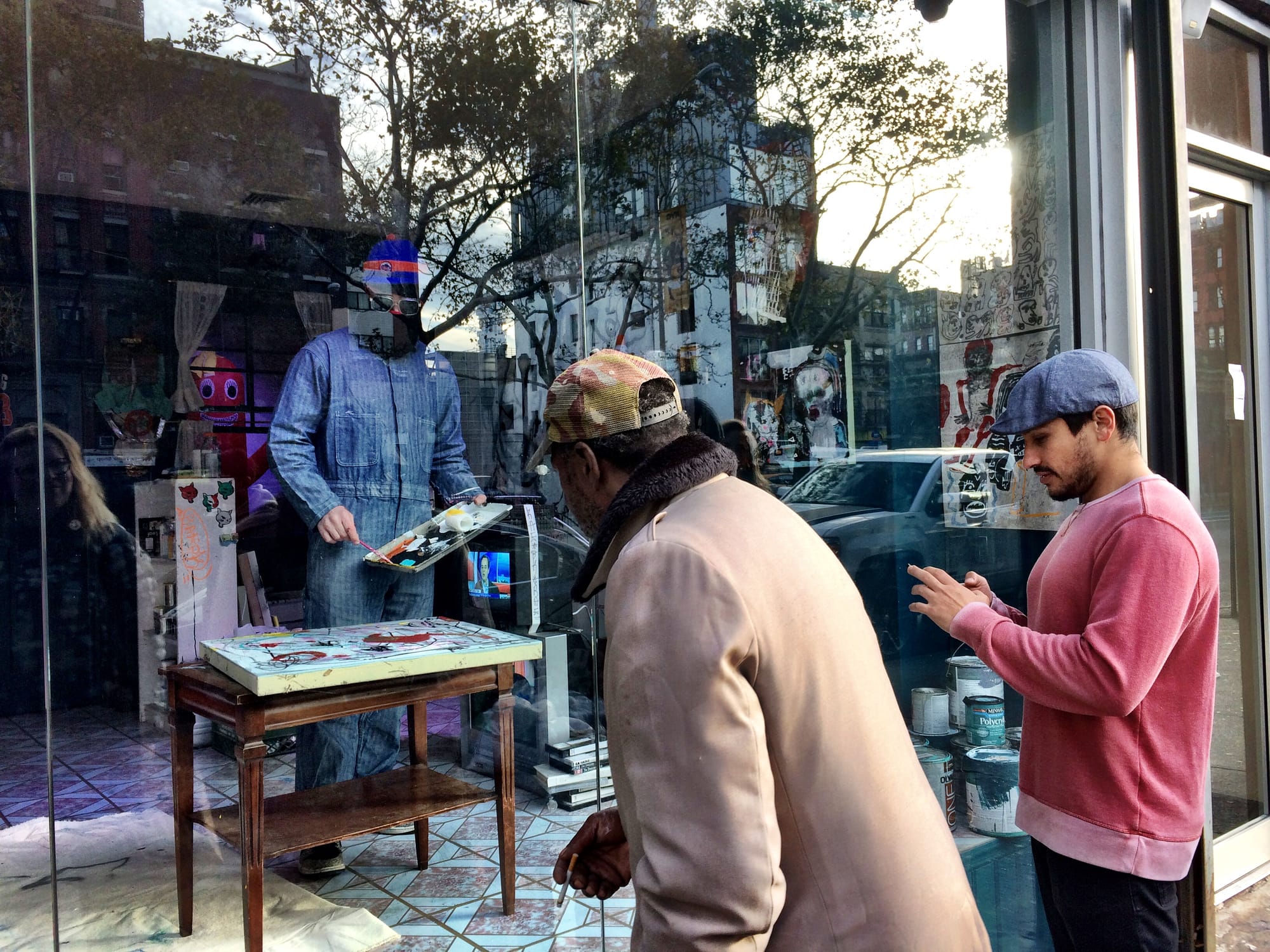 When I went to see RAE on a Saturday afternoon, he was painting while watching Christmas cartoons and the news on his two little, stacked TVs. Although it was interesting to watch him and try to predict what he’ll do next — it appears he likes to randomly stand completely still for about 30 seconds, kind of like a statue, so people watching see him in profile — one of the most interesting parts of this whole project isn’t in the project itself but rather in the conversations that happen just outside the storefront window. (Unfortunately, the YouTube channel only records sound from within the space, not from the street.)