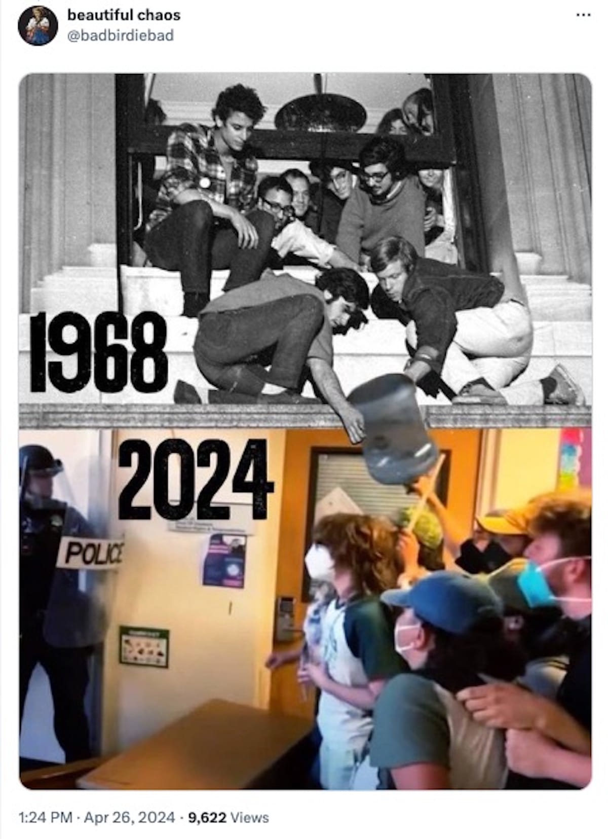 The current sweep of encampments popping up all over the country has reignited passionate conversations about historic student-led protests over the last few generations — especially the 1968 Columbia University uprising in response to the Ivy League school's support for the Vietnam War as well as allegations of a segregated gymnasium being built on campus. Though humorous, this edit shows intrinsic connections between student resistance of the past and present as issues of police violence, US-funded wars, racism, and classism pierce through the veil of progress over the last 60 years.
