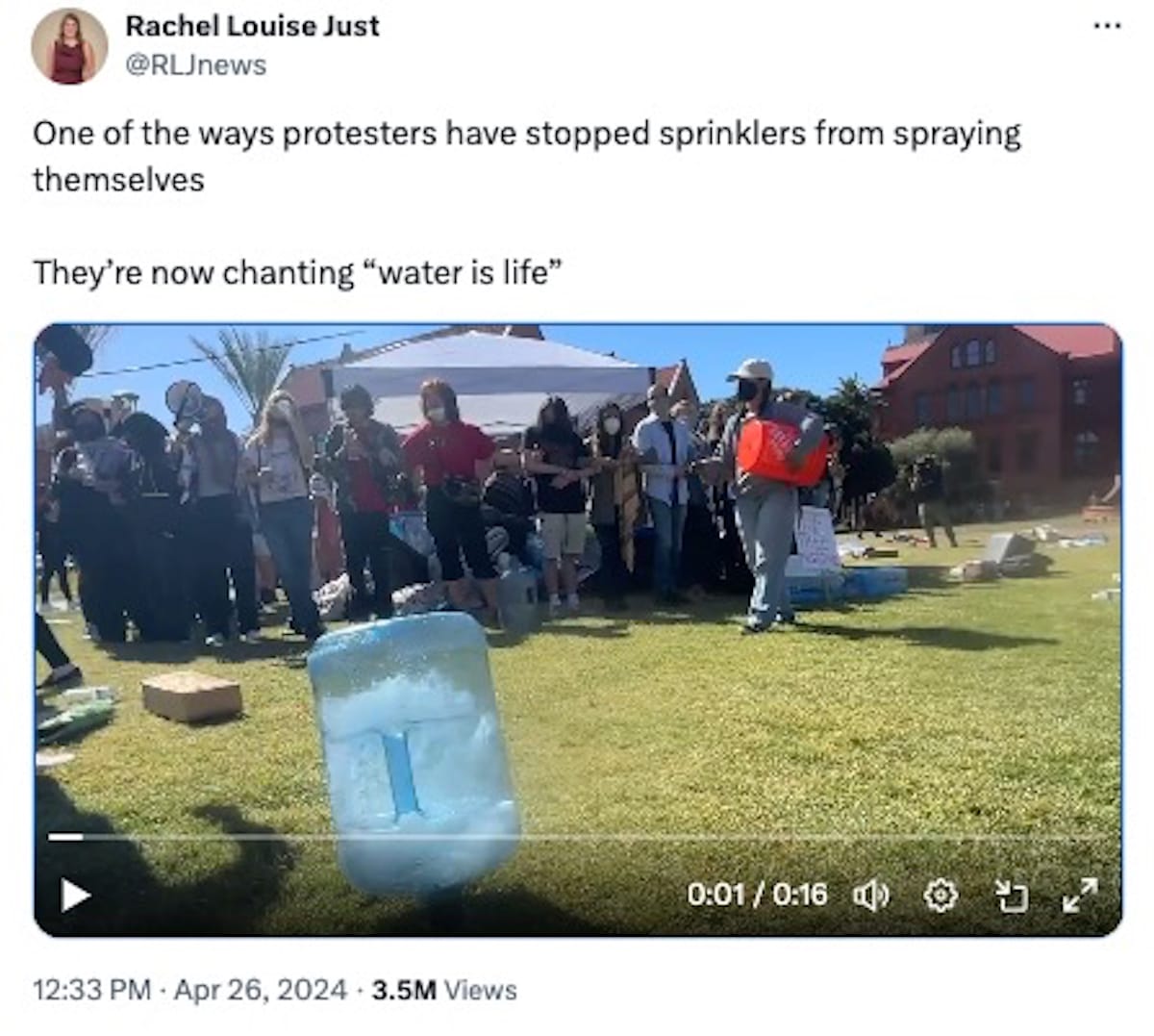 The water jug has multiple uses, as evidenced above. When Arizona State University used its sprinkler system against the campus's encampment, students jammed water jugs over the sprinkler heads to prevent their belongings from getting soaked. Nothing like a good old "reduce, reuse, recycle" moment to bolster the student movement.