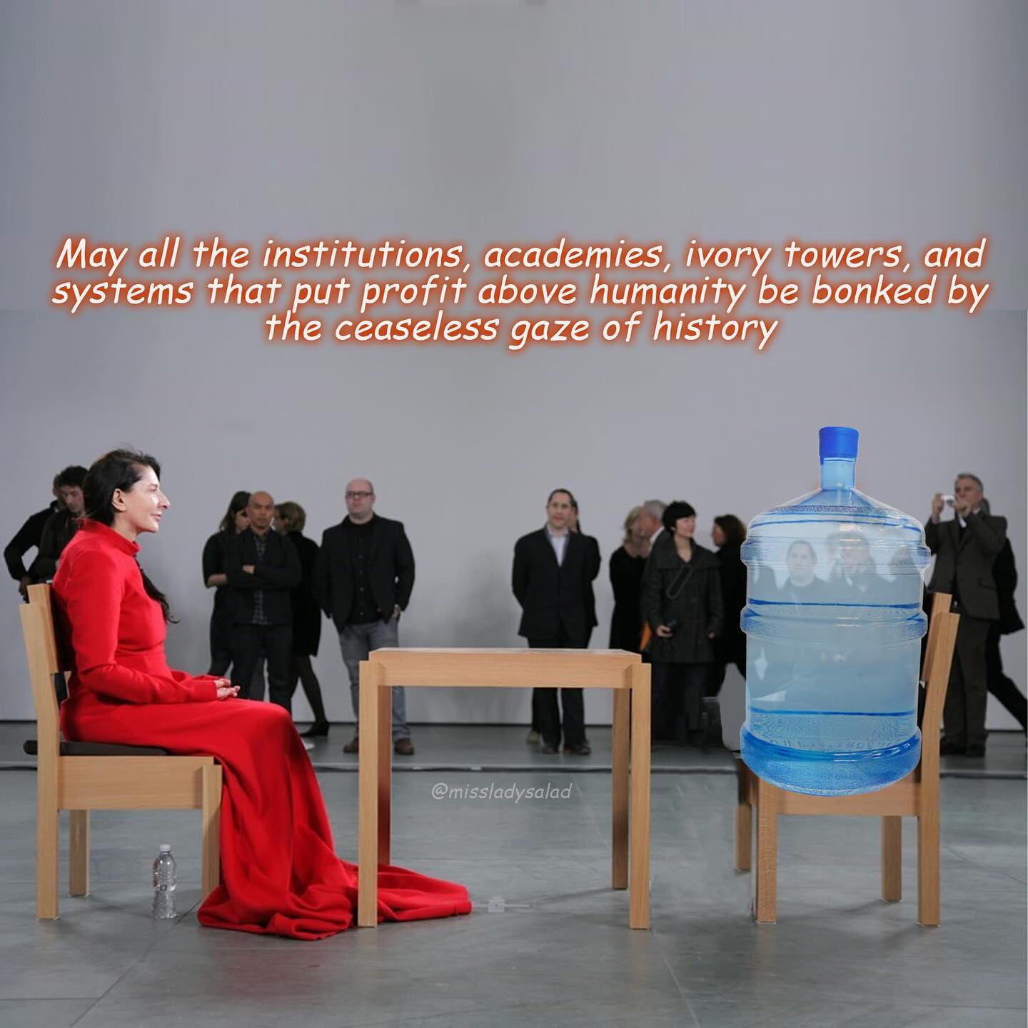 And as our dear friend Miss Lady Salad sardonically reminds us, though the bonk embodies the plucky, unperturbed spirit of contemporary student activism, it's critical to remember that the "jug of justice" is not a passing joke, but rather evidence that even against bullets, tasers, pepper spray, and arrests, there's nothing left to lose as the kids continue to push our institutions to divest from the forces that contribute to and benefit from the destruction of Gaza and its people.