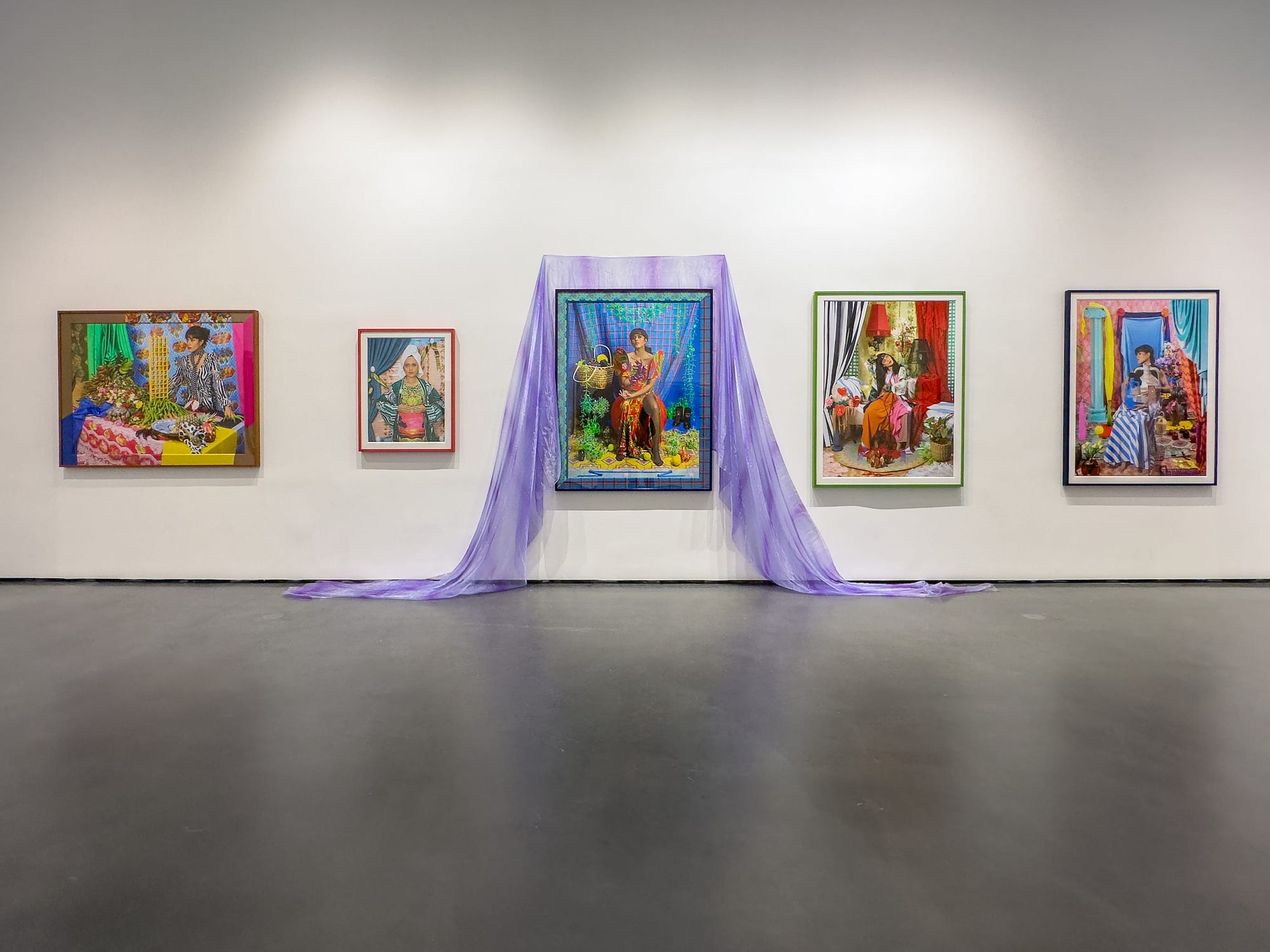 "Rosa’s Pandan (Volviendo)" (2023), centered in the gallery and framed by a lush lavender fabric, shows the artist in an opulent filipiniana terno dress, celebrating a festive folk song from the Visayas. Many colorful patterns extend beyond their frames, giving the images the sculptural presence of a more permanent fixture. Her scenography invites the viewer into the space of imagination, of entering private, well-tended home. Its interiors could be summarized as “Tropical Gothic,” a term coined by Filipino writer Nick Joaquin, pointing to a particular pastiche of ornamentation, baroque Catholic architecture, and bright, romantic palettes that artfully merges East and West.