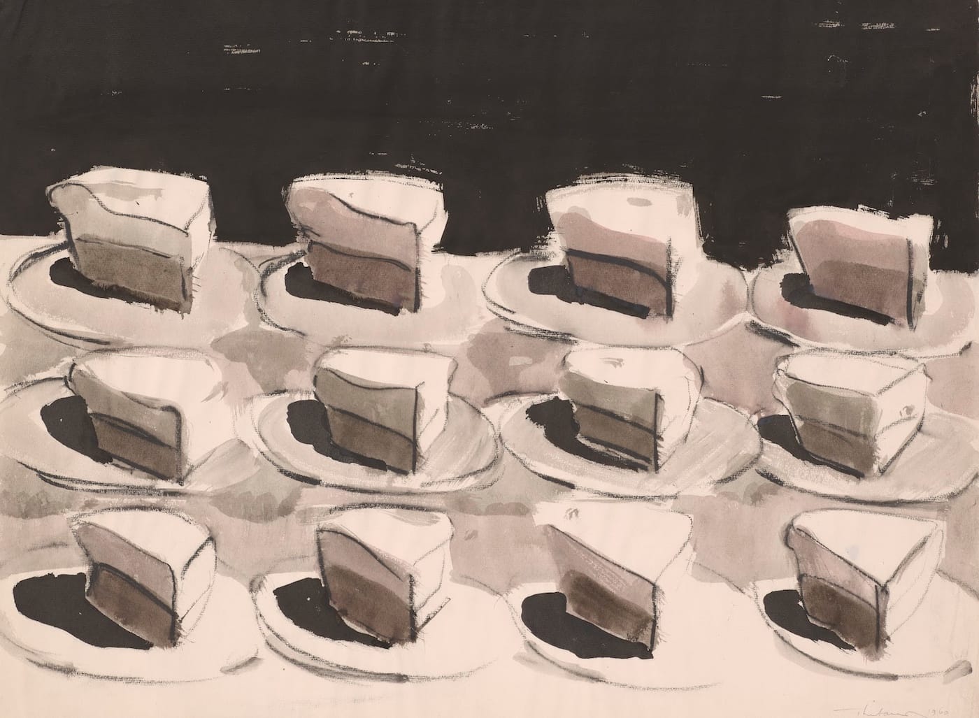 Thiebaud seems possessed by a voracious, joyful appetite. In the works done between 1949 and 1960, his different approaches to drawing recall the angularities of Yasuo Kuniyoshi and the rhythmic packing together of marks found in Philip Guston. By the time Thiebaud does “Shelf of Pies” (1960), he has pared down his drawing to a series of necessities. The slice of meringue is a three-dimensional triangle divided horizontally into light and dark halves. There are three rows of four slices filling the lower two-thirds of the composition, topped by a black background. The slices sit on elliptical plates, which rest on a tilted plane. This is Cubism 101 meeting all-over painting and the grid. It is brilliant and straightforward, at once realistic and dream-like.