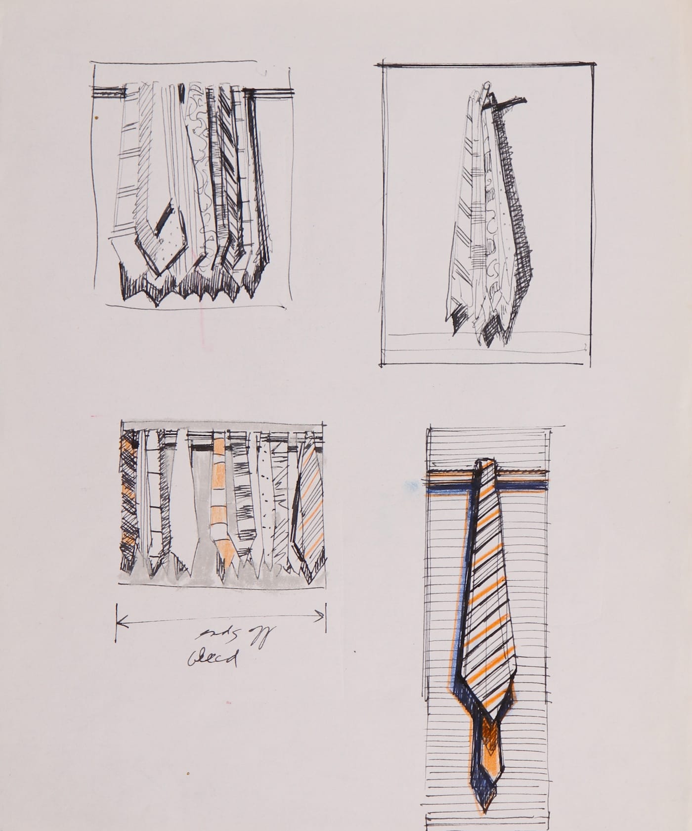 The other revelation lies in Thiebaud’s sketches. They tell us that he seems to be drawing all the time: he is a full-time student and observer. The exhibition includes pages of sketches that have never been exhibited before. Thiebaud uses a layout commonly found in commercial art, marked-off rectangles that he fills with sketches. I suspect he is looking for a subject or motif that he can return to in a painting. He makes 11 sketches in “Page of Sketches with Paint Cans” (ca. 1990), using pen and black and red ink. The 11 sketches are divided into three rows. A linear rectangle frames 10 of the 11 sketches. Most of the sketches are of paint cans but in the middle the artist switches his focus to lipstick. Looking at the sketches brought to mind the stirrings of another exhibition, one that would track the different routes one of his sketches might have inspired him to take.