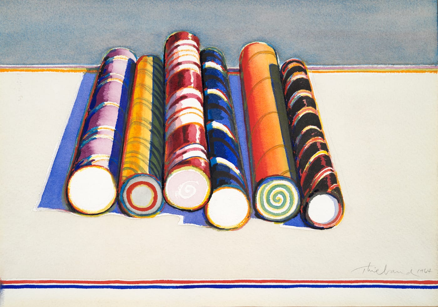 Try to wedge Wayne Thiebaud’s work into any art historical category, and you’ll likely be left with crumbs. He’s not quite a Pop Artist, even though his iconic paintings of pies, ice cream cones, and hamburgers share similarities with the movement’s American food portraitists: Andy Warhol and Claes Oldenburg. And he’s not an Abstract Expressionist either, even though some of his brushstrokes are gestural and he befriended the movement’s greats (such as Willem de Kooning and Franz Kline).