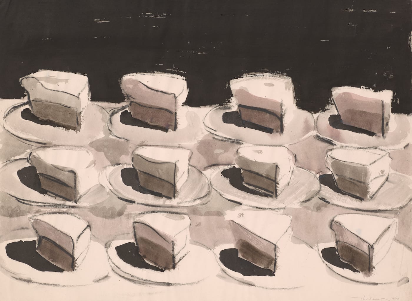 Something shifted for Thiebaud when he painted his first pie painting. Hewanted to start fresh and focus on formal concerns of composition, shapes, and color. Many may look at his plated slices of pumpkin, blueberry, and apple pie and see triangles, but as of his very first painted slice (which Thiebaud claims was pumpkin) he saw them as a combination of the shapes that fascinated the Post-Impressionist painter Paul Cézanne.