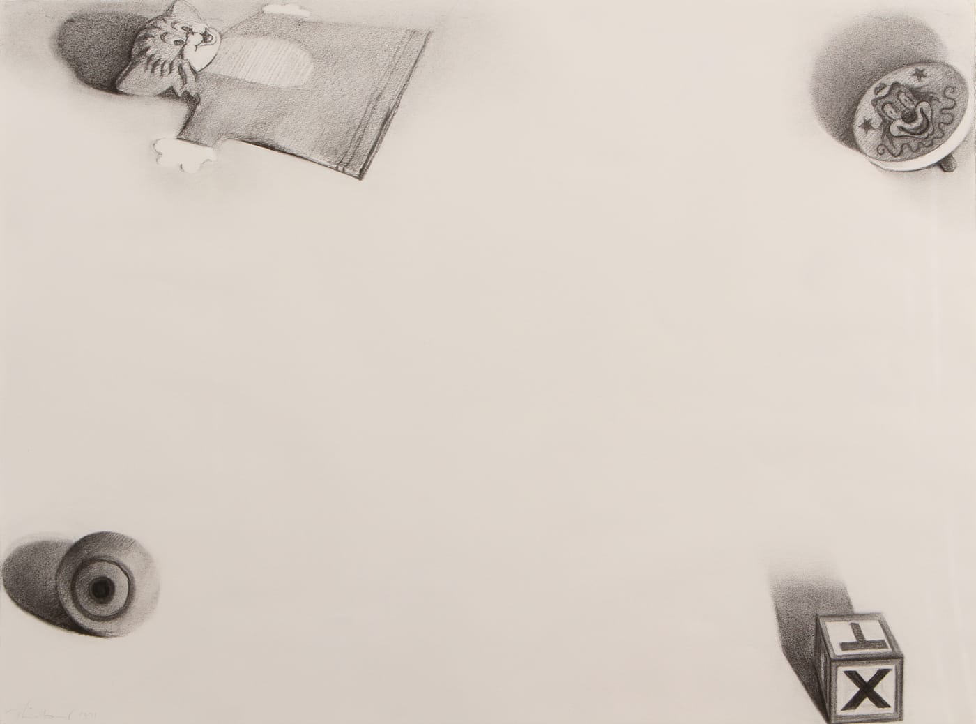 Sometimes Thiebaud literally made the same marks as his creative icons, making copies after other artists. (Thiebaud regularly instructs his drawing students to: “Copy pictures. Enjoy the hell out of it.”) One of these, exhibited in Wayne Thiebaud, Draftsman, is a copy of a Giorgio Morandi still life drawing. Thiebaud has reproduced it in its entirety, down to the signature.